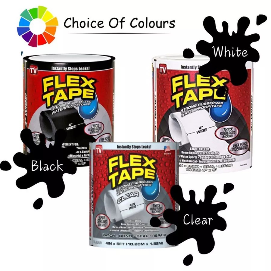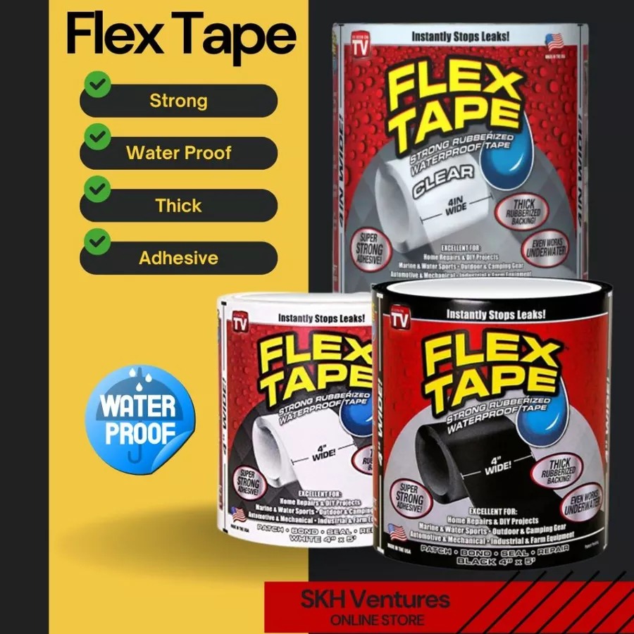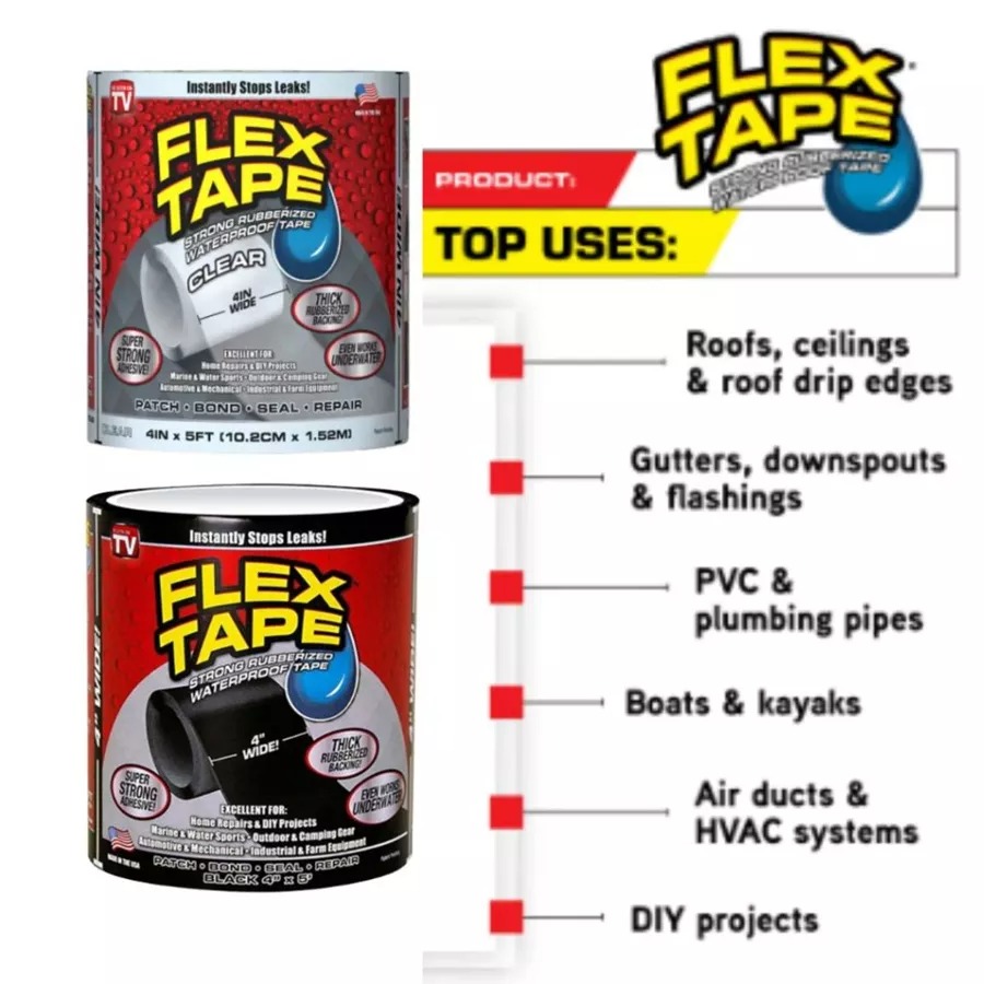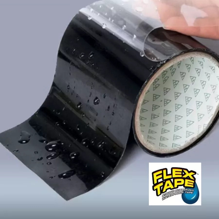 FLEX TAPE is a super strong, rubberized, waterproof tape that can patch, bond, seal and repair virtually everything!- FLEX TAPE is specially formulated with a thick, flexible, rubberized backing that conforms to any shape or object!