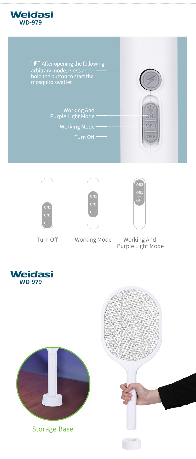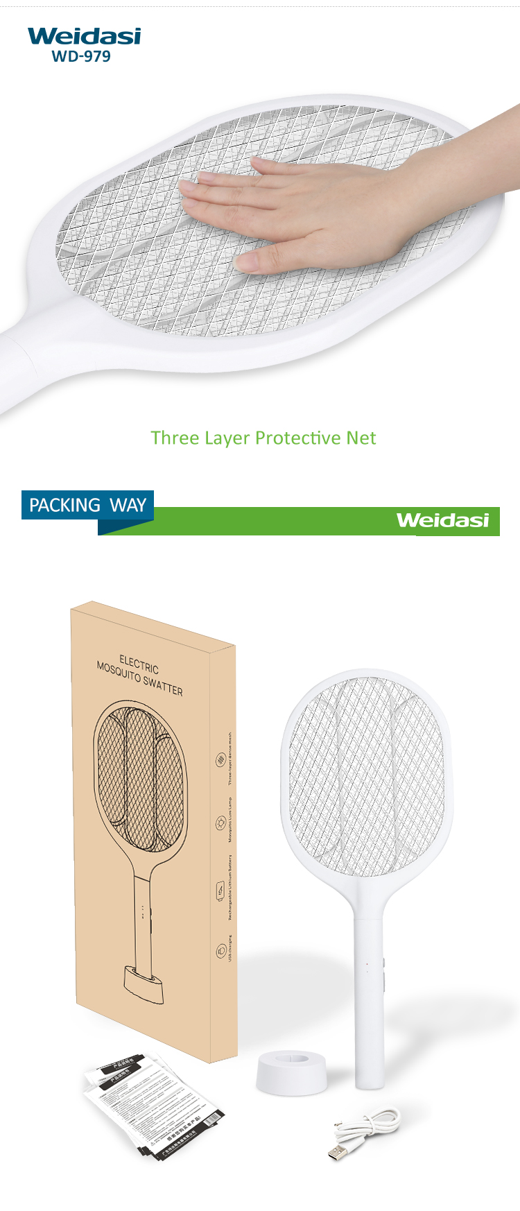 2. After the mosquito swatter is stopped using, it has the function of automatically eliminating the residual electricity on the high-voltage net surface;