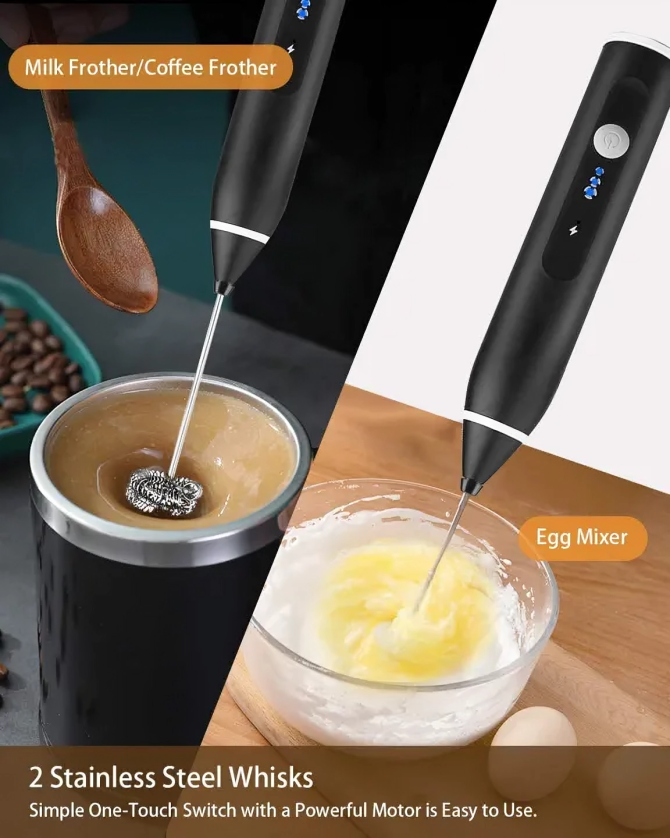 DOUBLE WHISKS: The rechargeable milk frother comes with 2 different whisks,easy and free to switch.Double whisks electric milk frother can be good helperin different situations such as liquid 2.foods,milkshakes,cocktails,eggs,soups etc.