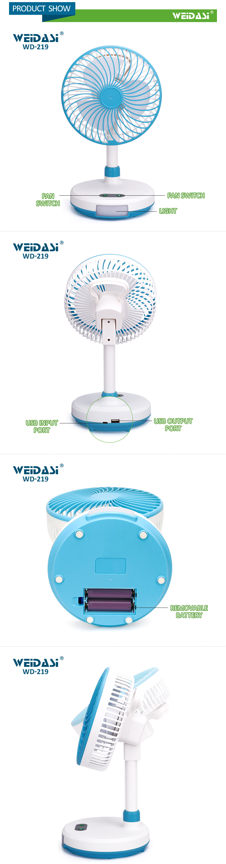 - The output power of fan: strong wind gear is about 4W,mid-range wind is about 3W and weak wind gear is about 2W. • Over voltage protection during charging for product, automatic protection when battery voltage reaches 4.2V.