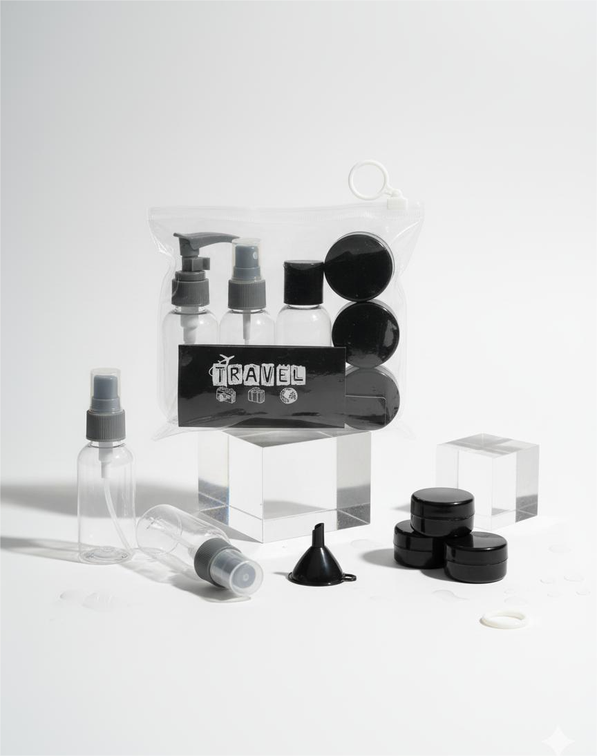 Organize your travel essentials effortlessly with the Refillable Cosmetic Container Kit Travel Bottle Set – 8 Piece (Black. Designed for modern travelers, this set includes a variety of refillable bottles and jars for shampoo, lotion, toner, and other liquid products. Made from high-quality leak-proof plastic, it’s durable, reusable, and safe for all your skincare and beauty needs.