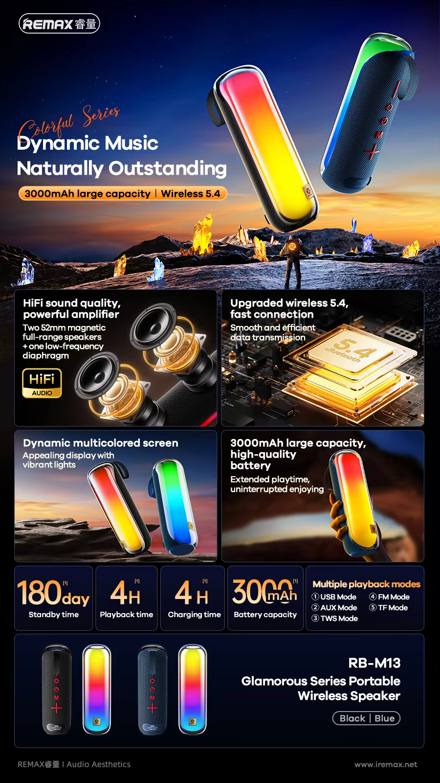 1 pc SpeakerThe REMAX Glamorous Series RB-M13 Portable Wireless Speaker is a compact and stylish audio solution designed for outdoor use. Featuring a 5W output power, Bluetooth connectivity with a 10-meter transmission range, and a built-in 3000mAh battery, this wireless speaker ensures reliable performance. Its portable design and compatibility with mobile phones make it an ideal choice for on-the-go entertainment.
