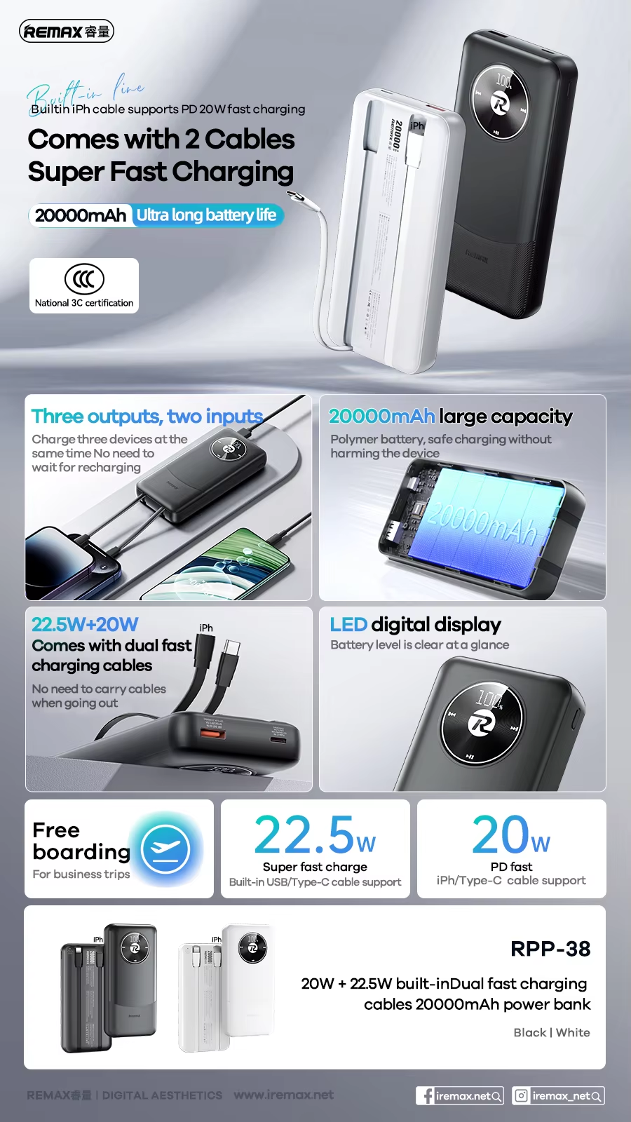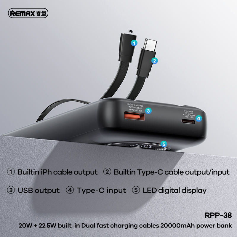 REMAX RPP-38 20W+22.5W Built-in Dual Fast Charging Cables 20000mAh Power Bank