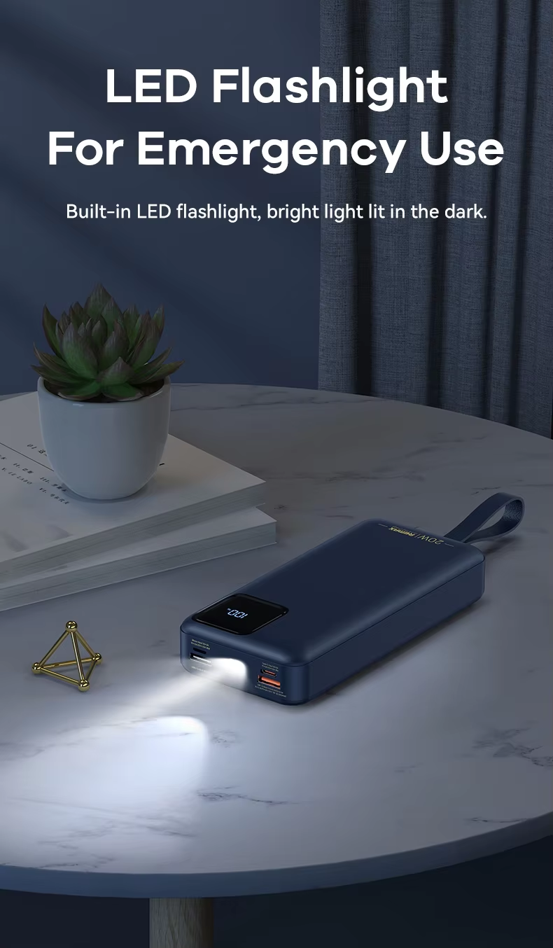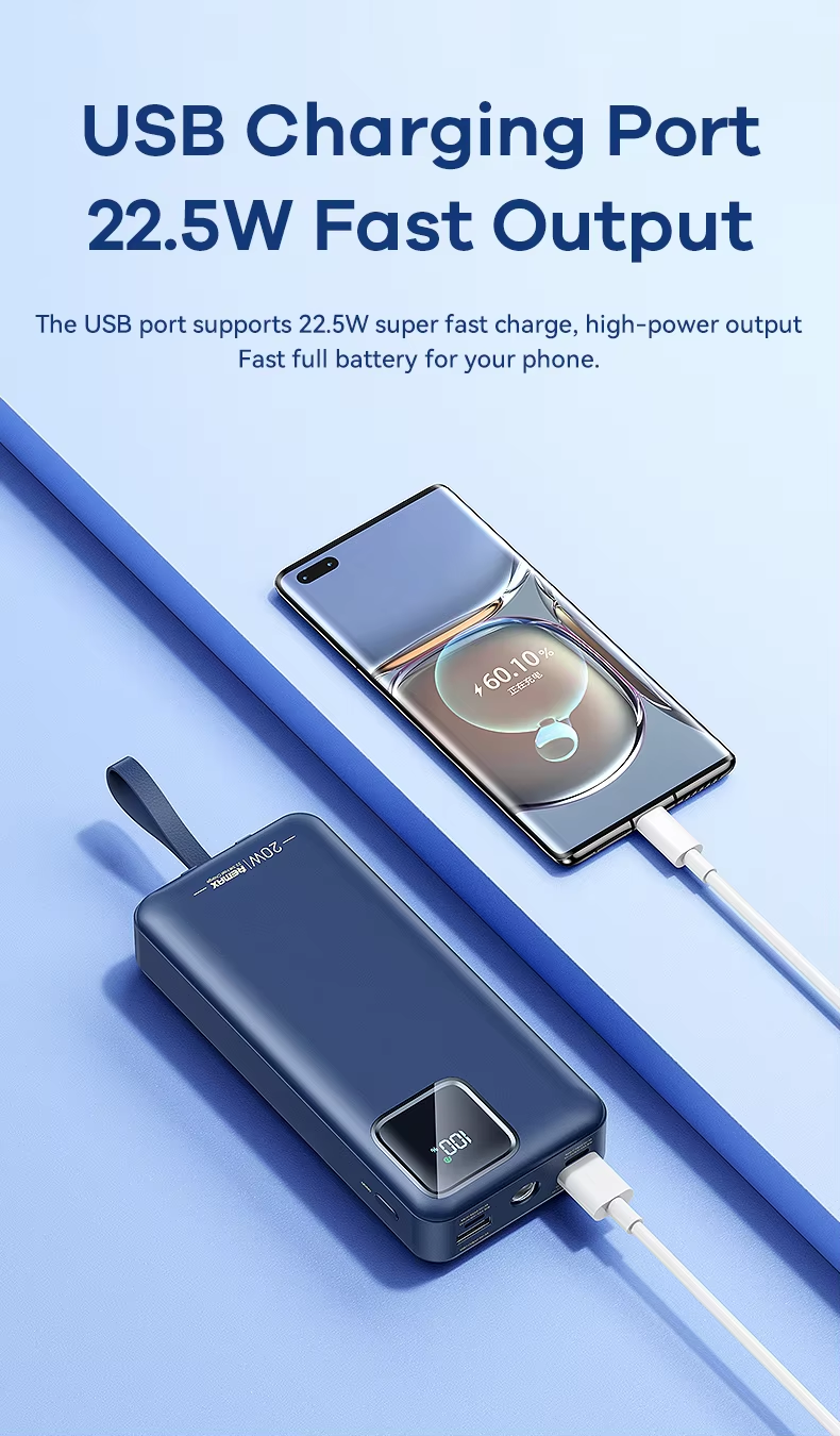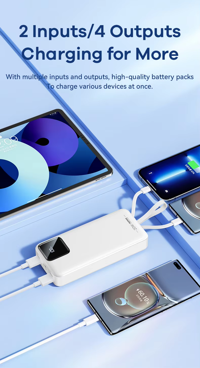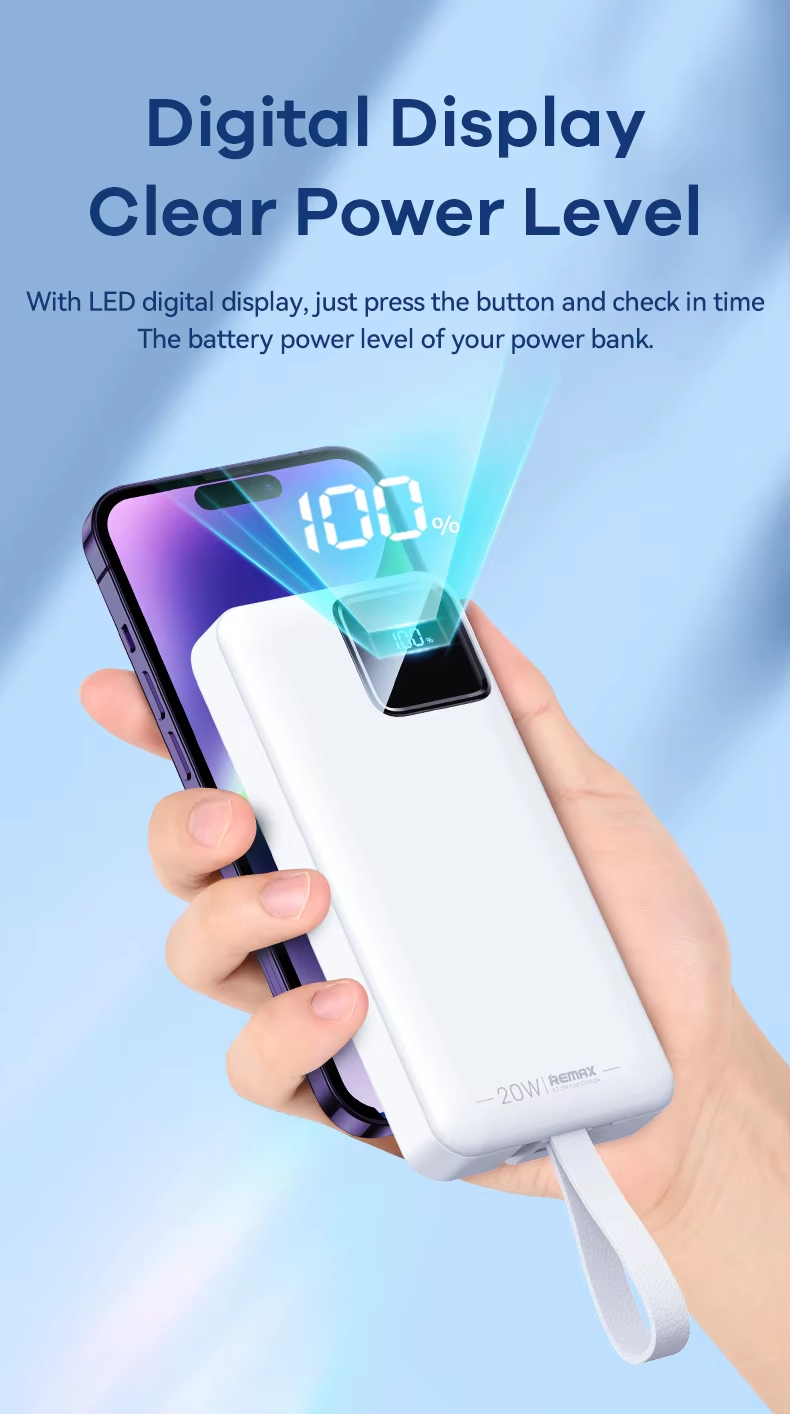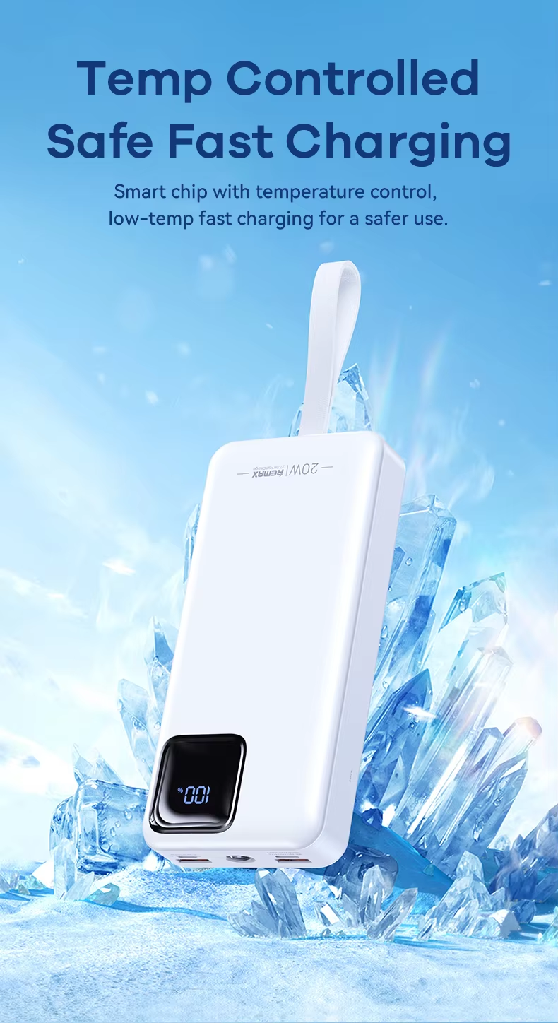 This Remax power bank features a 30000mAh high-capacity design with dual built-in fast charging cables, supporting 22.5W Type-C super fast charge and PD20W flash charge. It includes multi-protocol compatibility, LED flashlight for emergencies, smart digital display for battery status, and a fireproof ABS+PC casing ensuring safety and durability. Certified by CE, FCC, and RoHS, it guarantees compliance with international safety standards, providing market access assurance.
