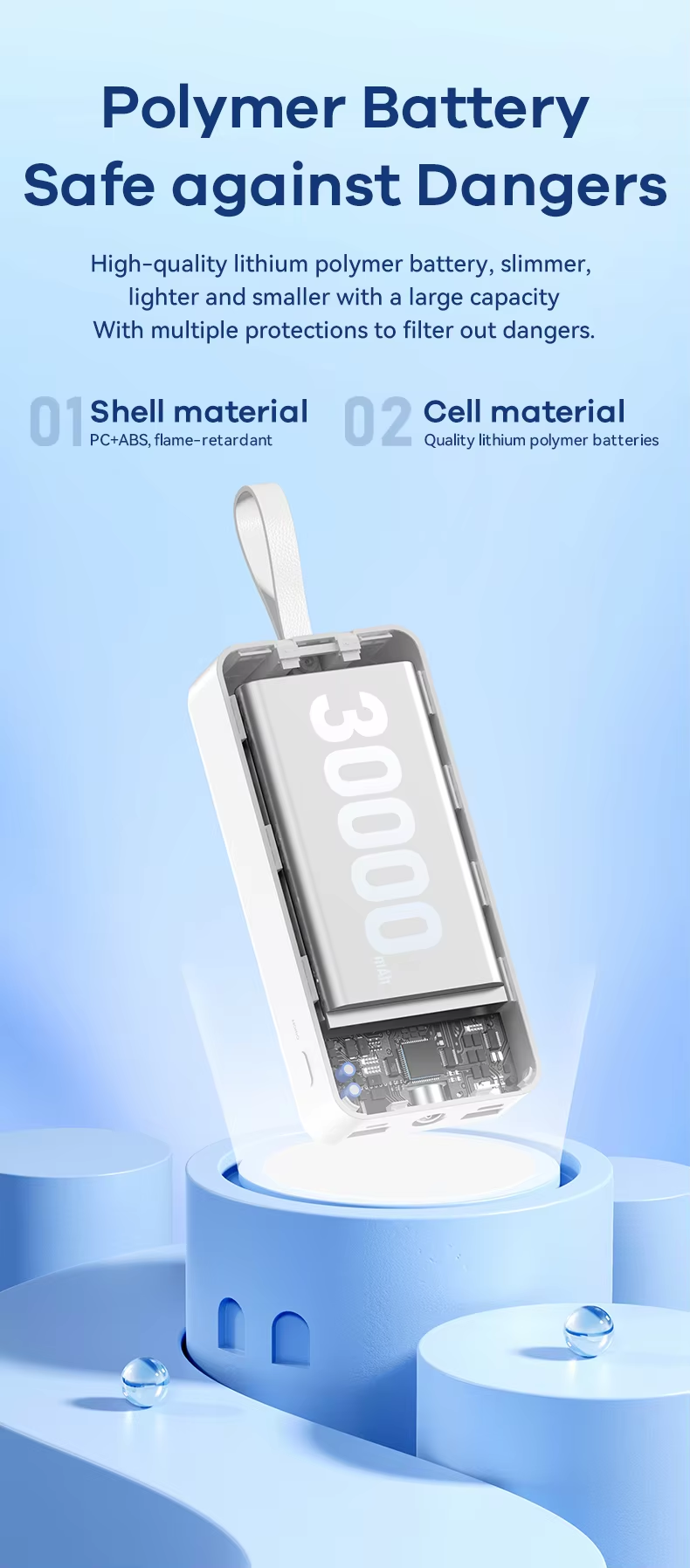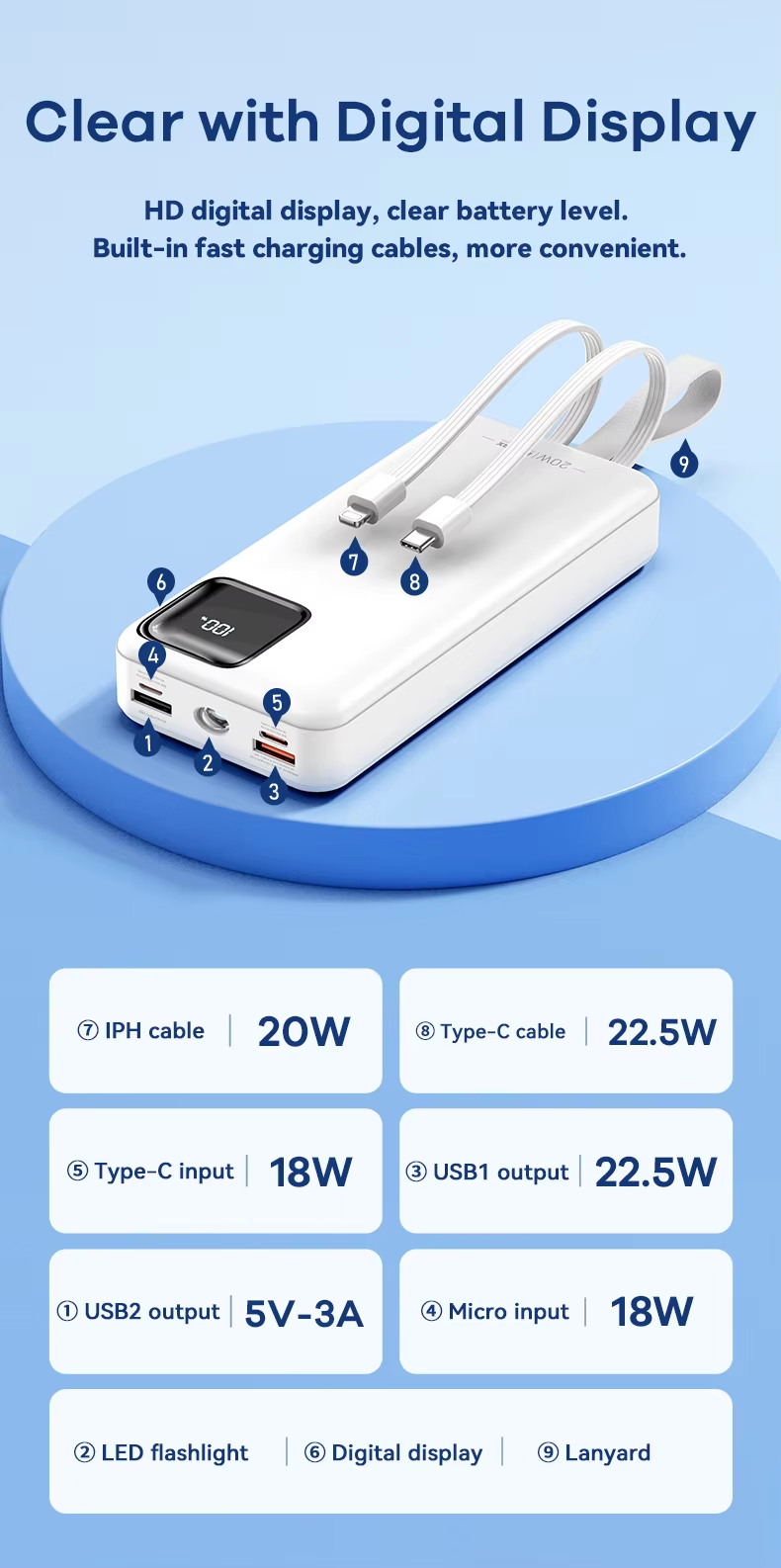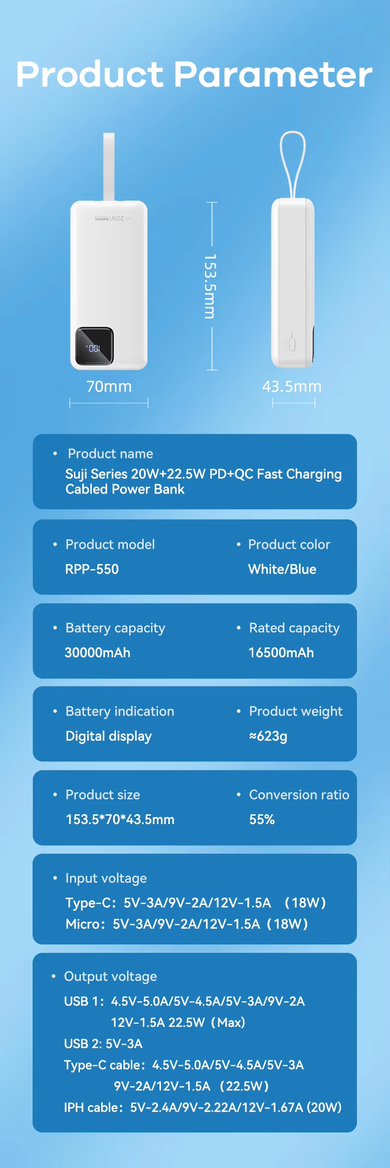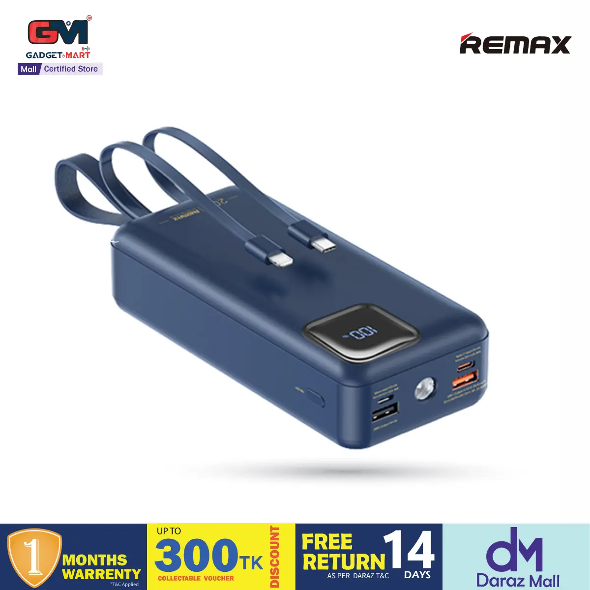 This Remax power bank features a 30000mAh high-capacity design with dual built-in fast charging cables, supporting 22.5W Type-C super fast charge and PD20W flash charge. It includes multi-protocol compatibility, LED flashlight for emergencies, smart digital display for battery status, and a fireproof ABS+PC casing ensuring safety and durability. Certified by CE, FCC, and RoHS, it guarantees compliance with international safety standards, providing market access assurance.