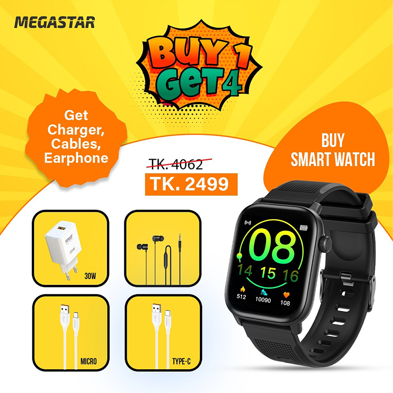 Buy Smart Watch Get Free 30W Charger Type C and Micro Cables Earphone Offer (Buy 1 Get 4)