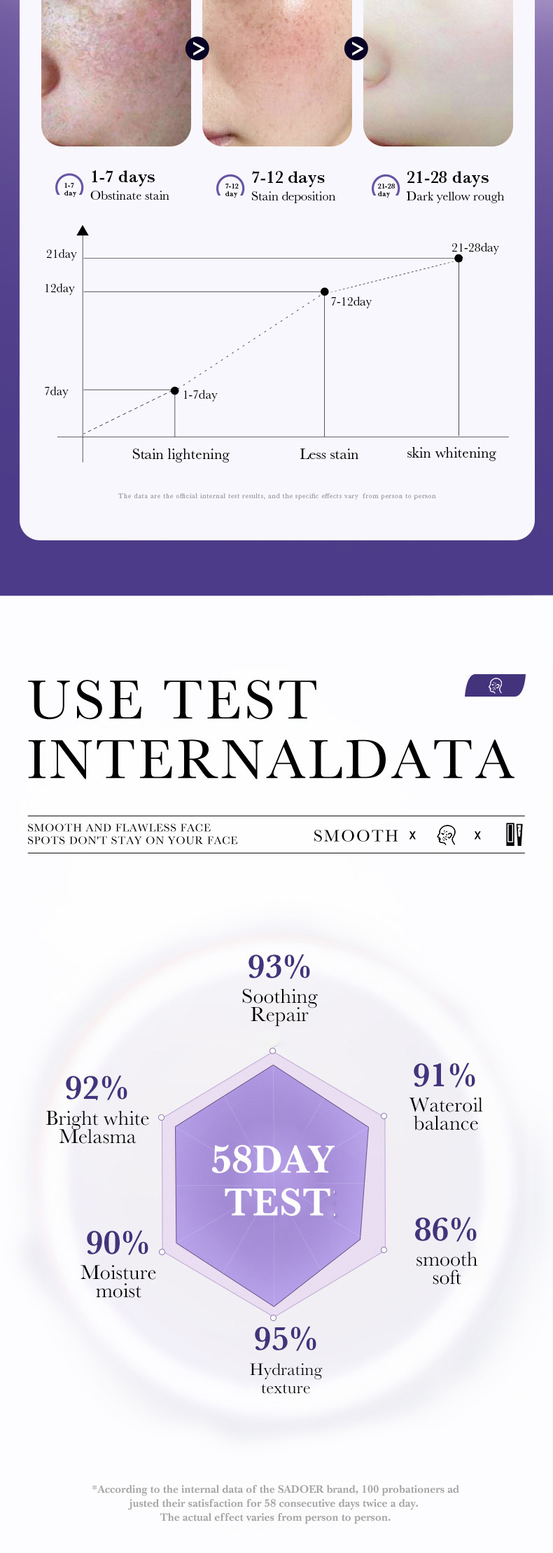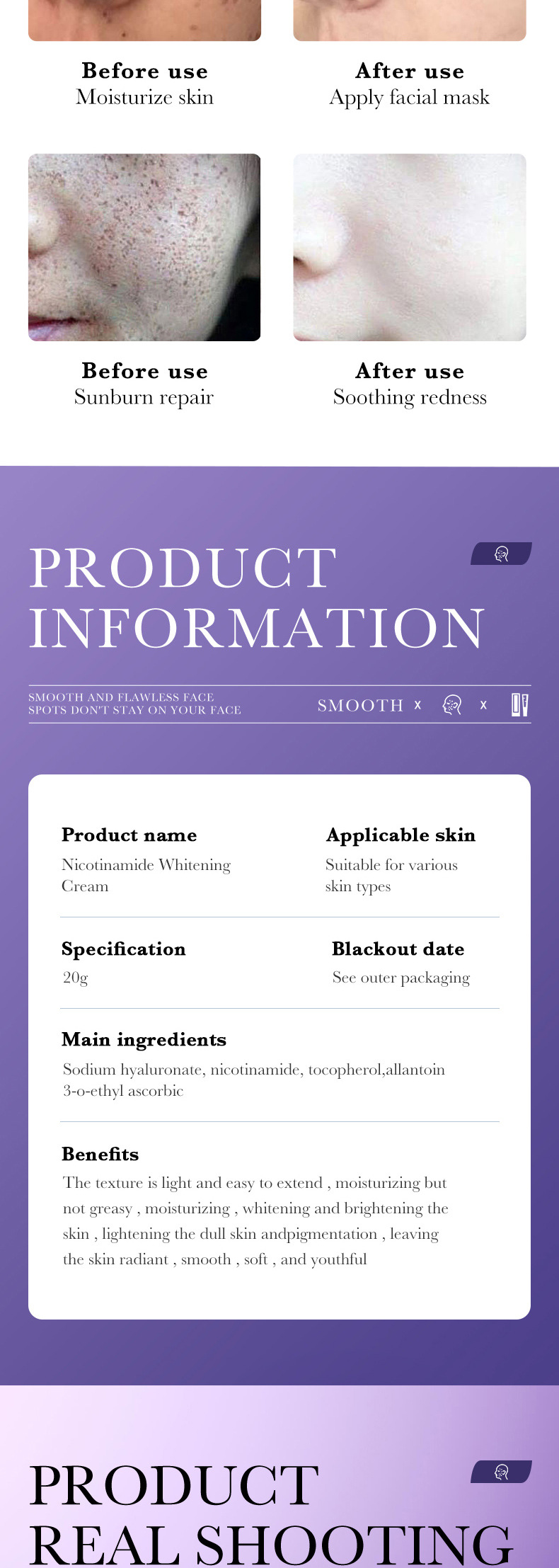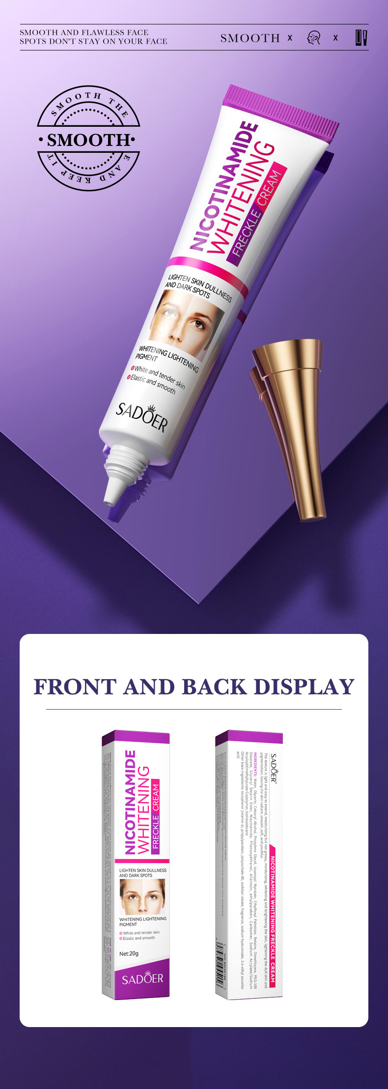 SADOER নিকোটিনামাইড হোয়াইটেনিং ফ্রেকল ময়শ্চারাইজিং ক্রিম ময়শ্চারাইজিং হাইড্রেটিং লাইটেনিং স্পট ফেস ক্রিম 20g পণ্যের কার্যকারিতা: টেক্সচারটি হালকা এবং প্রসারিত করা সহজ, ময়শ্চারাইজিং কিন্তু চর্বিযুক্ত নয়, ময়শ্চারাইজিং, ত্বককে ঝকঝকে এবং উজ্জ্বল করে, নিস্তেজ ত্বককে হালকা করে এবং পিগমেন্টেশন করে, ত্বককে উজ্জ্বল, মসৃণ, নরম এবং তরুণ রাখে। কিভাবে ব্যবহার করে: ত্বক পরিষ্কার এবং পুনরুজ্জীবিত করার পরে, এই পণ্যটি মুখে লাগান এবং সম্পূর্ণরূপে শোষিত না হওয়া পর্যন্ত ম্যাসেজ করুন। মন্তব্য: যেহেতু প্রত্যেকের ত্বকের ধরন আলাদা, তাই এটি আপনার কানের পিছনের ত্বকে পরীক্ষা করার পরামর্শ দেওয়া হয় যদি জ্বালা, ত্বকে ব্যাথা, আঘাত বা ত্বকে ফুসকুড়ি হয়, তাহলে অনুগ্রহ করে এটি ব্যবহার করবেন না এবং ডাক্তারের সাথে পরামর্শ করুন। অবিলম্বে এটি ব্যবহার বন্ধ করুন এবং কোনো অ্যালার্জির প্রতিক্রিয়ার ক্ষেত্রে একজন চর্মরোগ বিশেষজ্ঞের সাহায্য নিন। যদি পণ্যটি দুর্ঘটনাক্রমে চোখের মধ্যে ছড়িয়ে পড়ে তবে অবিলম্বে আপনার চোখ ধুয়ে ফেলুন।