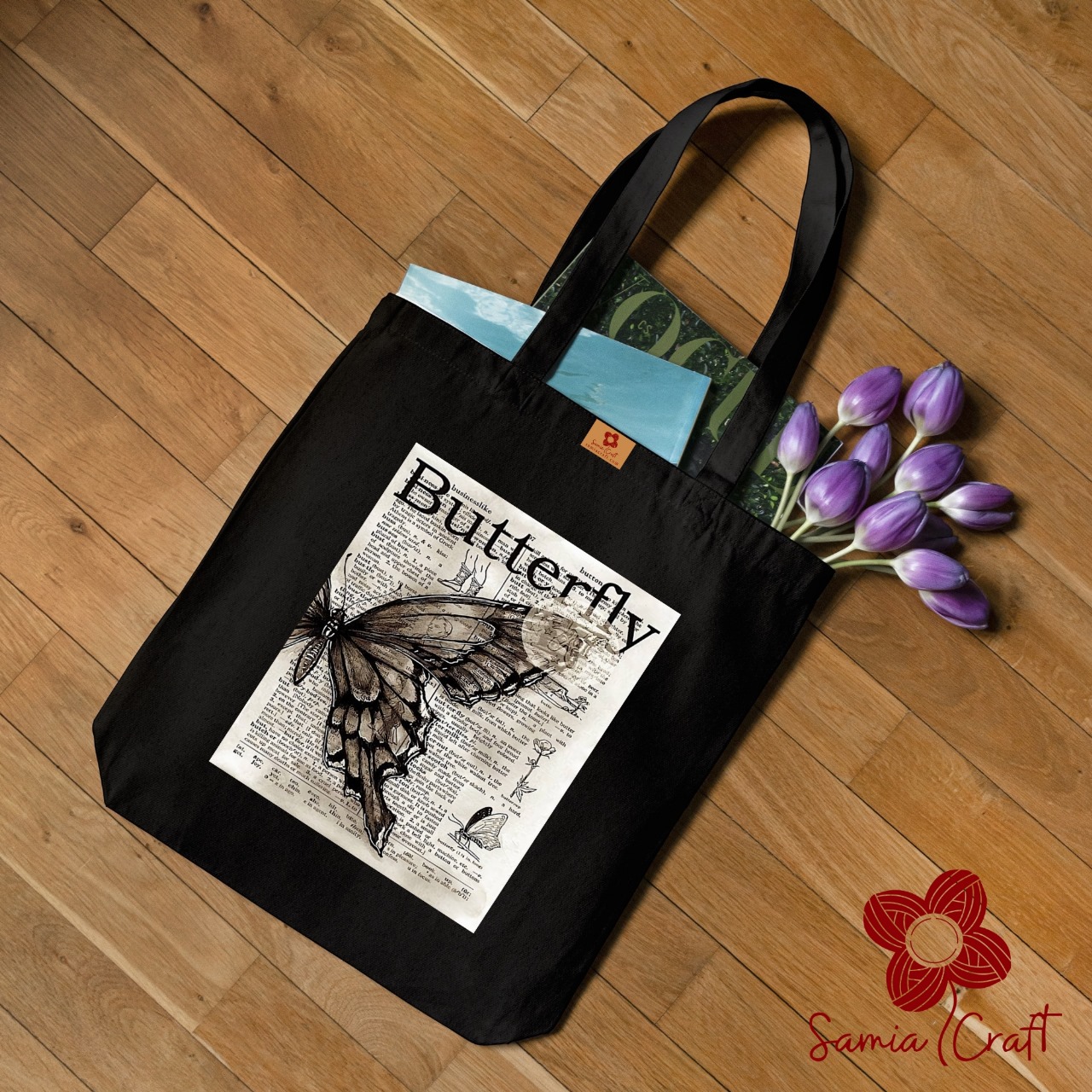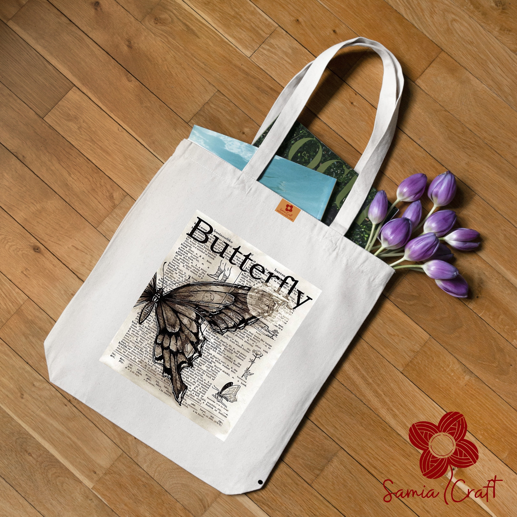 Samia Craft Trendy Butterfly and Text Design Cotton Canvas Tote Bag with Zipper - Stylish Modern bag for School College University