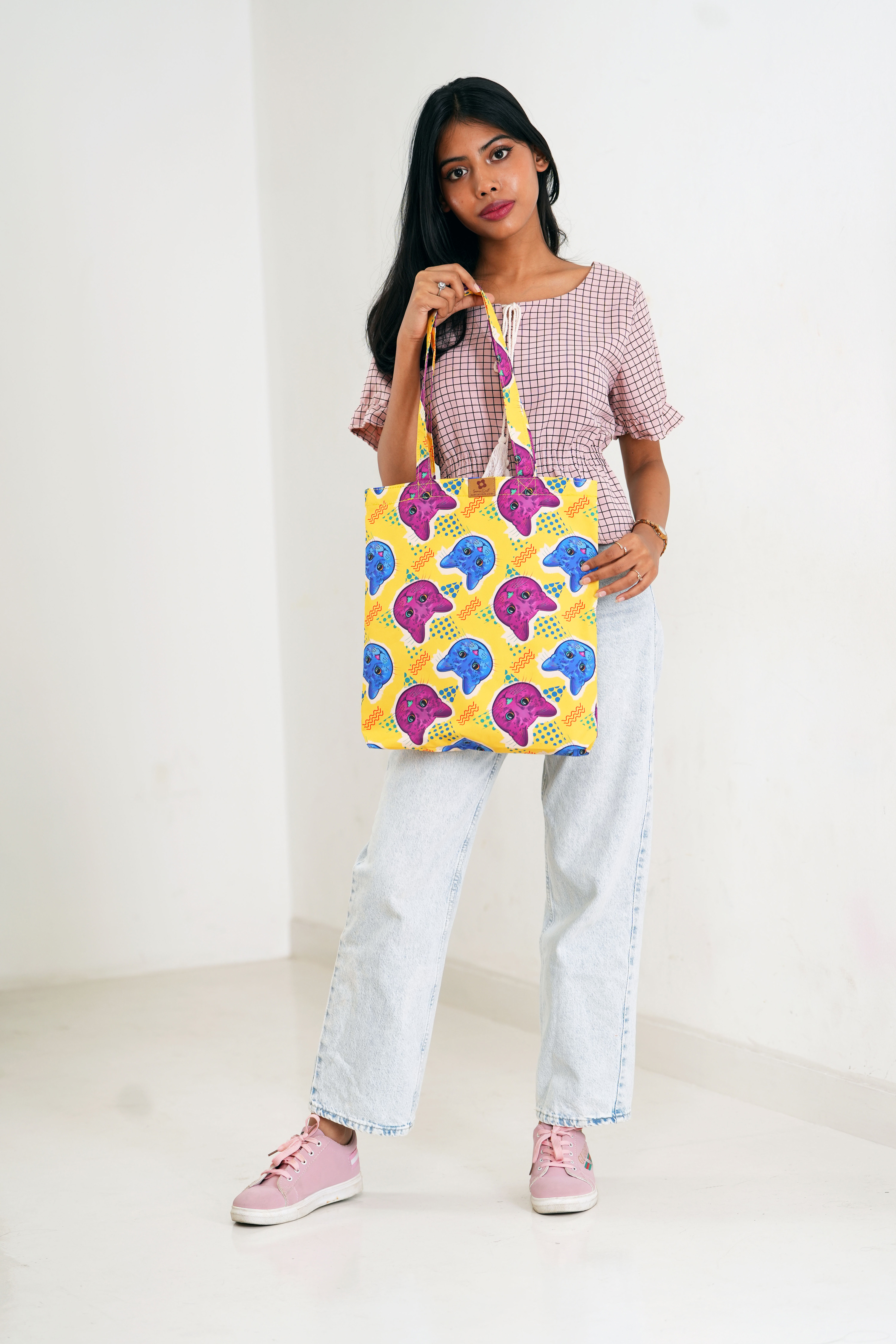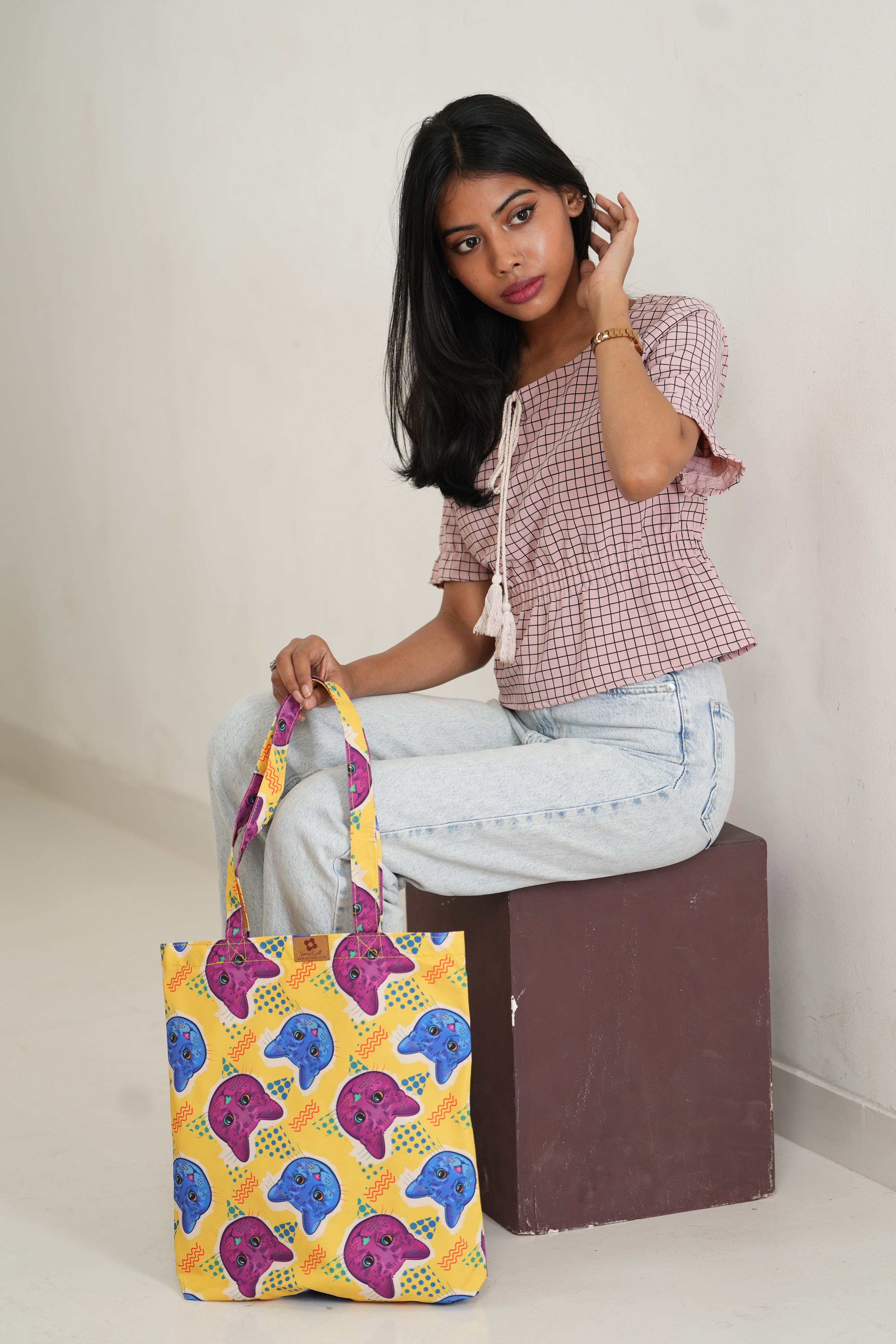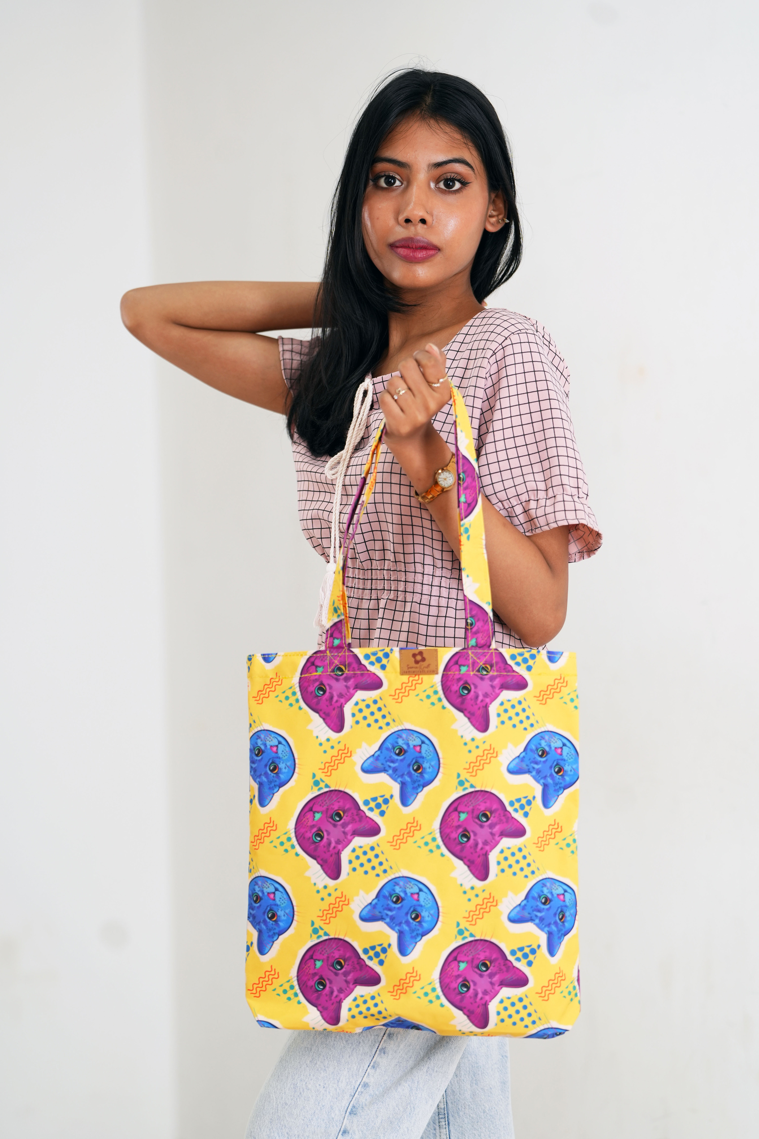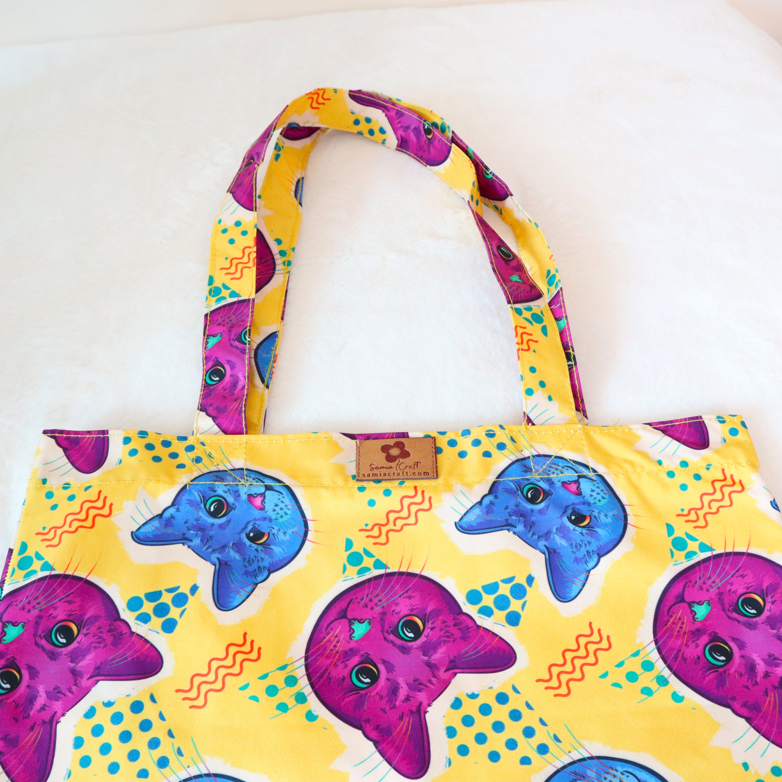 Boasting an all-over printed fabric with a cat gradient zine culture theme, this tote bag adds a touch of contemporary artistry to your wardrobe. Showcase your love for cats and cultural vibes with this unique and eye-catching design.