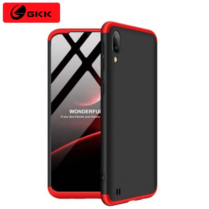 Samsung Galaxy M10 GKK Case 360 Degree 3 in 1 Full Body Protection Hard PC Case Cover - Black & Red Case Samsung Galaxy M10. It features a slim, lightweight design with a matte finish and a unique 3-piece structure that securely locks onto the phone. The case also includes camera protection with slightly raised edges around the rear lens.