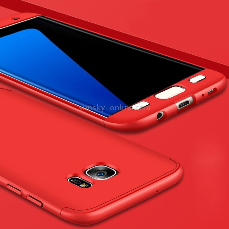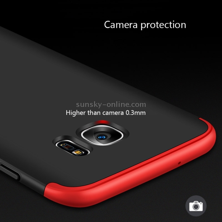 Samsung Galaxy S7 Edge GKK Case 360 Degree 3 in 1 Full Body Protection Hard PC Case Cover - Black & Red Case Samsung Galaxy S7 Edge. It features a slim, lightweight design with a matte finish and a unique 3-piece structure that securely locks onto the phone. The case also includes camera protection with slightly raised edges around the rear lens.