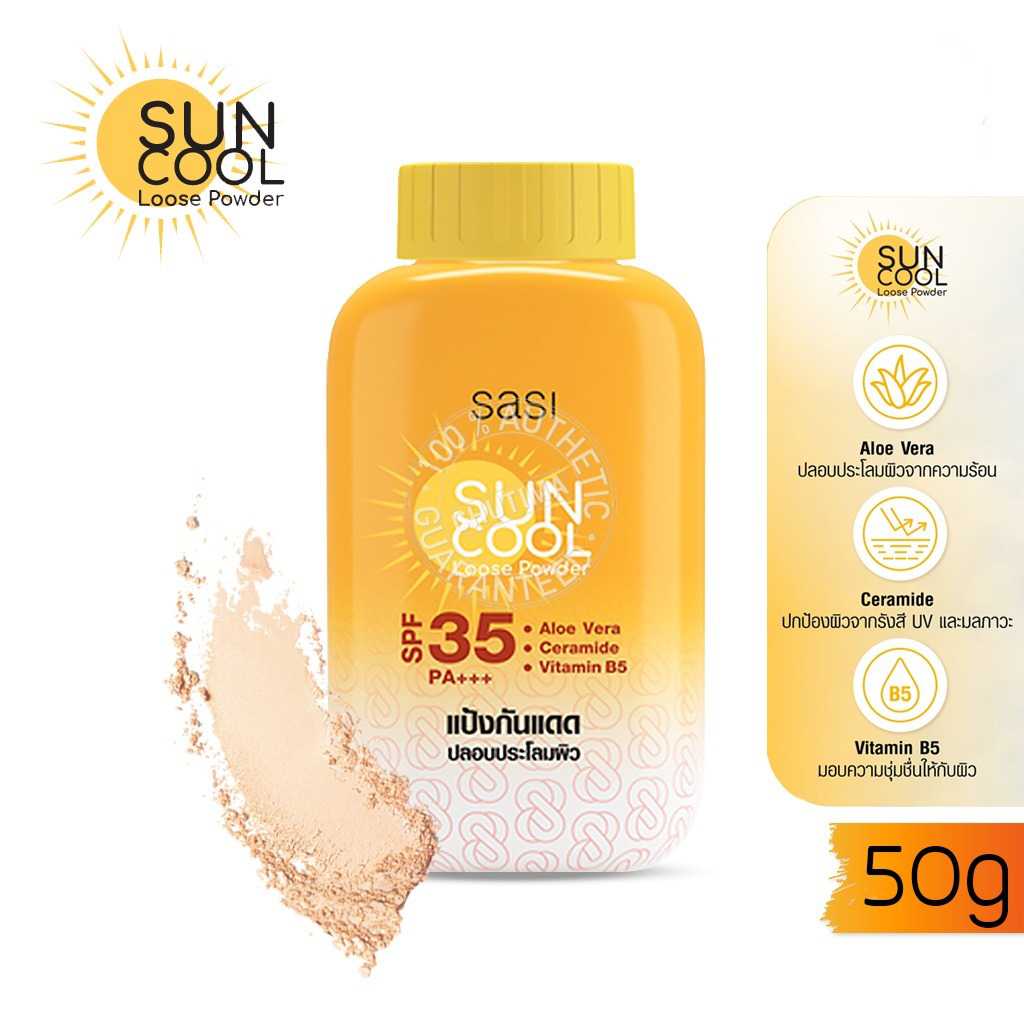 Sasi Sun Cool Loose Powder Loose powder for sun protection SPF 35 PA+++. Calming and soothing your skin from heat and irritation Protect your skin from UV rays, help calming and soothing your skin from the heat with fresh and relaxing feeling instantly after use, and hold oily faces for up to 12 hours. Ceramide Create the shield to protect your skin from the harmful effects of UV rays and pollution. Aloe Vera Calming and soothing your skin from heat and irritation Vitamin B5 help locking in your skin & moisture.