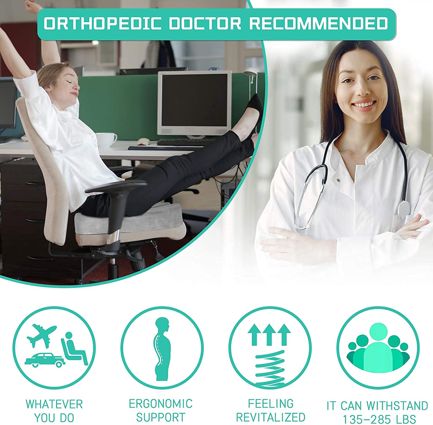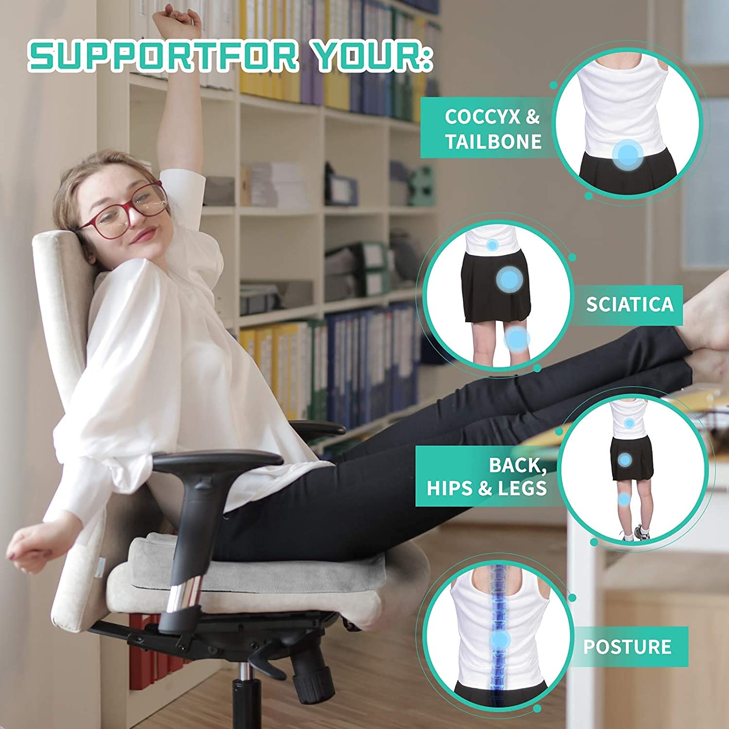 - Pain Relief for Back, Legs, Hips, and Sciatica: Designed to provide comfort by alleviating pressure on the lower back, waist, hips, and thighs. Our office chair cushion also helps relieve sciatica symptoms, allowing you to power through your day. Its curve design minimizes the pressure that other chair pillows can cause to improve blood circulation