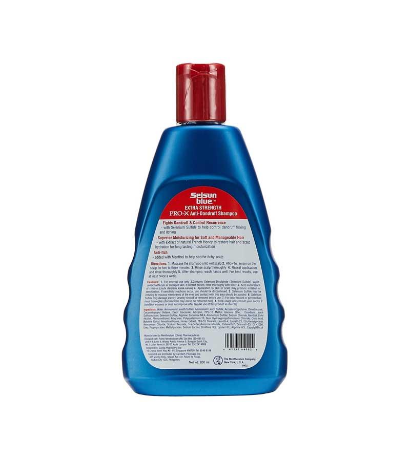 Selsun Blue Pro-X Extra Strength Anti-Dandruff Shampoo is formulated with selenium sulfide that attacks the root source of dandruff. Laboratory tests have proven its effectiveness in treating dandruff and controlling its recurrence. The conditioning honey moisturizes and softens hair while the menthol helps soothe the itchy scalp, minimizing discomfort.