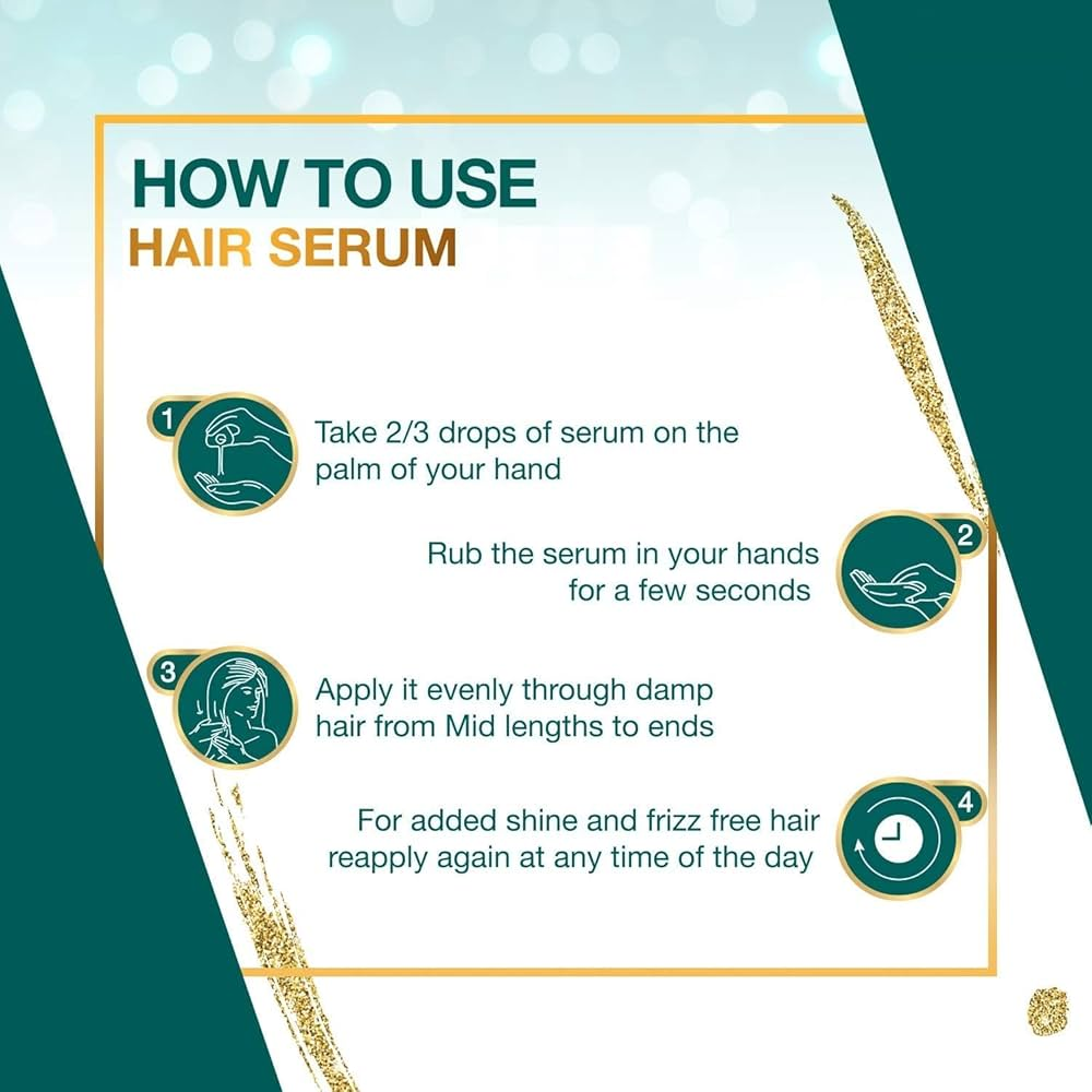 How to use: STEP I:Take 2/3 drops of serum on the palm of your hand STEP II:Rub the serum in your hands for few seconds. STEP III:Apply it evenly through damp hair from Mid lengths to ends STEP IV:For added shine and frizz free hair reapply again any time of the day.