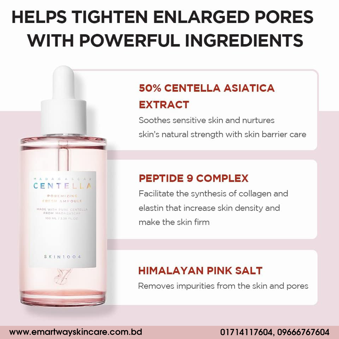 The SKIN1004 Madagascar Centella Poremizing Fresh Ampoule is a lightweight, non-sticky serum designed to minimize pores, enhance skin elasticity, and provide hydration. Perfect for oily, combination, and sensitive skin types, this ampoule is your go-to solution for a refreshed and balanced complexion.