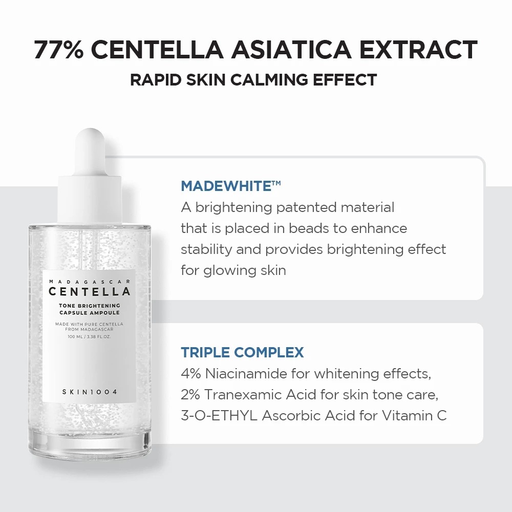 Centella Asiatica Extract: Calms and soothes irritated skin while strengthening the skin barrier.- Brightening Capsules: Infused with capsules that target dark spots and uneven skin tone for a luminous complexion.