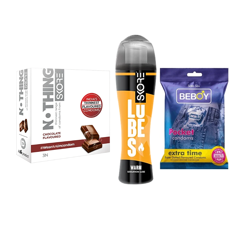 Skore Warm Combo = 6Pcs Condom + Skore Warm Lube Gel 60ml + Skore Nothing Chocolate 3s + Beboy Extra Time 3s
