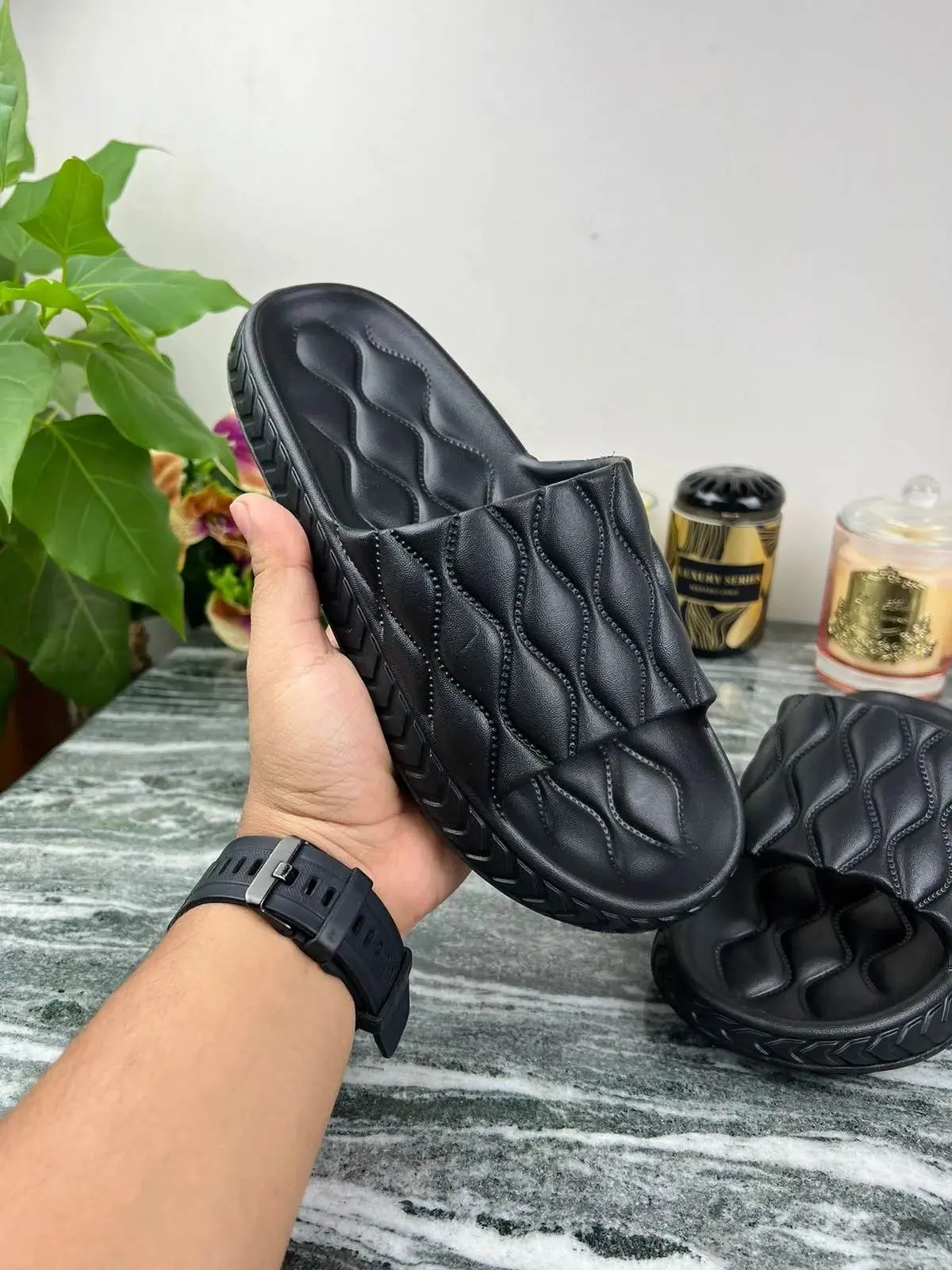 Introducing the SunMoon-1001 Slide Slipper for Men and Boys, the perfect combination of style and comfort. Available in black, grey, and aura green, these casual slides are suitable for both indoor and outdoor use. Made with non-leather material and a rubber/EVA sole, these slides are durable and long-lasting. The wedge closure ensures a secure fit, while the EVA material family provides a lightweight feel. These slides are perfect for any season and are designed by Slides, a trusted name in footwear. Whether you're lounging at home or running errands, the SunMoon-1001 Slide Slipper is the perfect choice for any occasion.