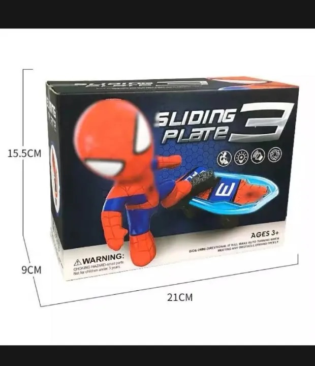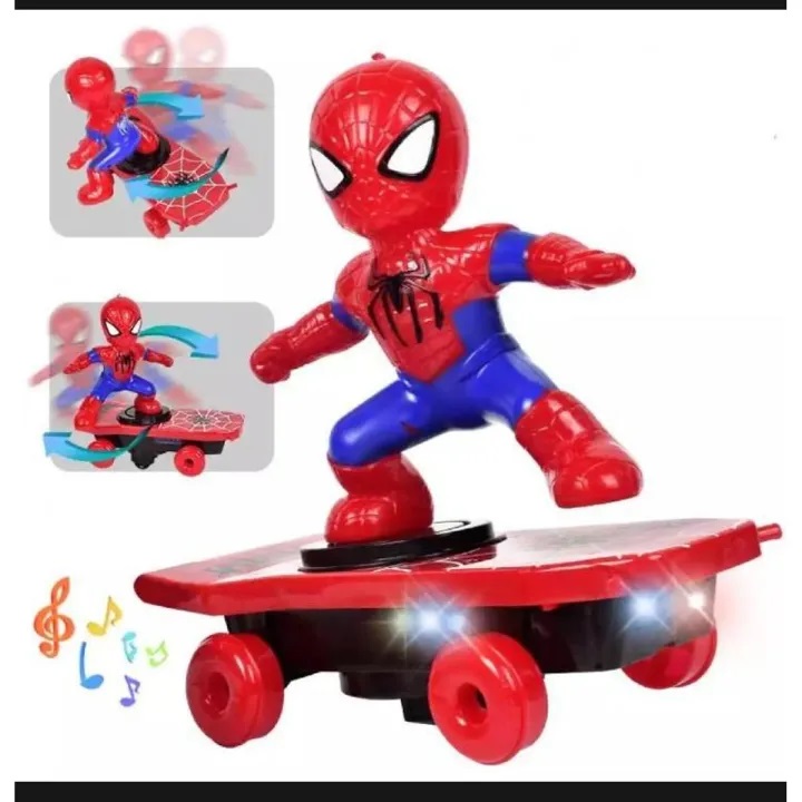 Spider man skate board toys for kids It will do amazing way of stunts while playing the toy will rotate 360 degrees on the skate board during driving. During driving the sliding plate will fell down and the little boy stood up as soon as it rotated it has randomly stunts actions kids love it's very much