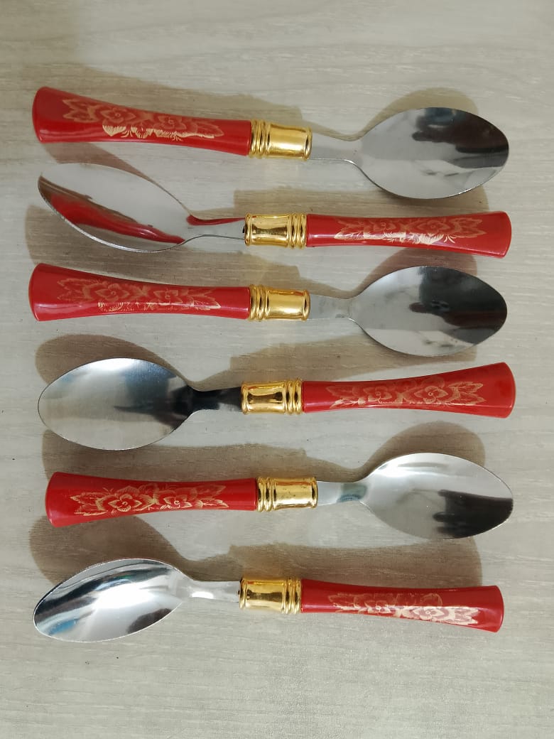 Material : Stainless steen Color : Red & black Style : Modern Size : 15cm long Spoon type : spoon Quantity : 6 pcs set Product : Same as picture.
