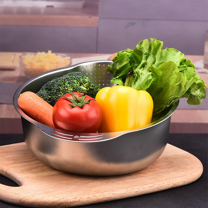 High-quality materials: Our stainless steel rice washing basin is made of high-quality stainless steel, which is non-toxic, harmless, rust-proof, durable and not easy to deform. Practical design: The humanized tilted mouth design makes it easier to pour and hold debris. Multi-function: It can not only be used to wash rice, but also to wash various grains, fruits and vegetables. It can be used as an ordinary mixing bowl or dough bowl to meet the various needs of the home kitchen. Easy to clean: The stainless steel rice washing basin has a smooth design, is easy to clean, and will not leave food residues. Space-effective: The simple design and compact size make it easy to store and will not take up too much storage space. Suitable for kitchens of any size.