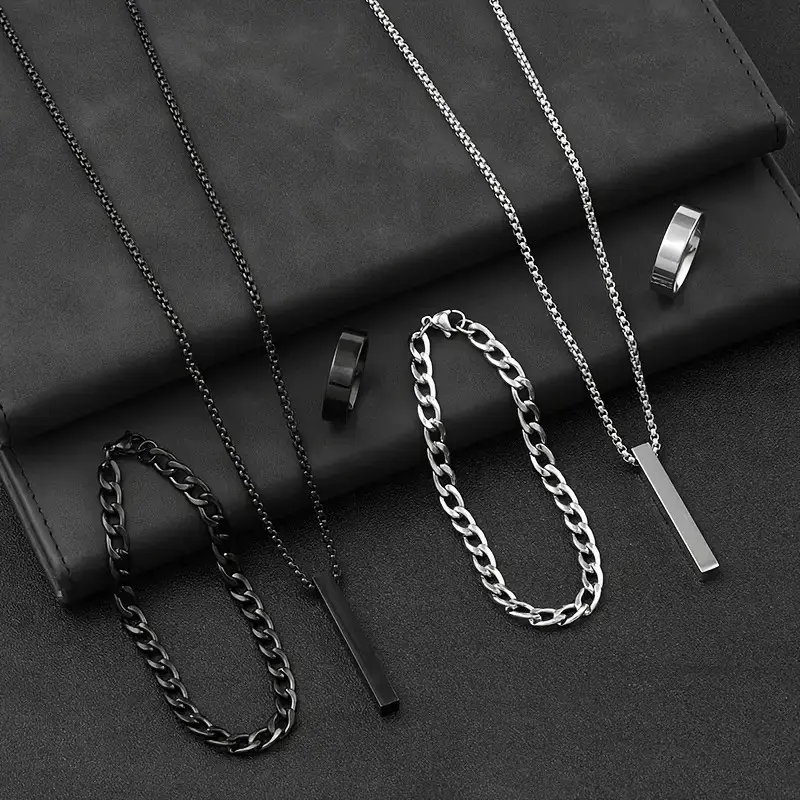 Stainless Steel Geometric Pendant Necklace -Necklace Bracelet & Ring Set for Men