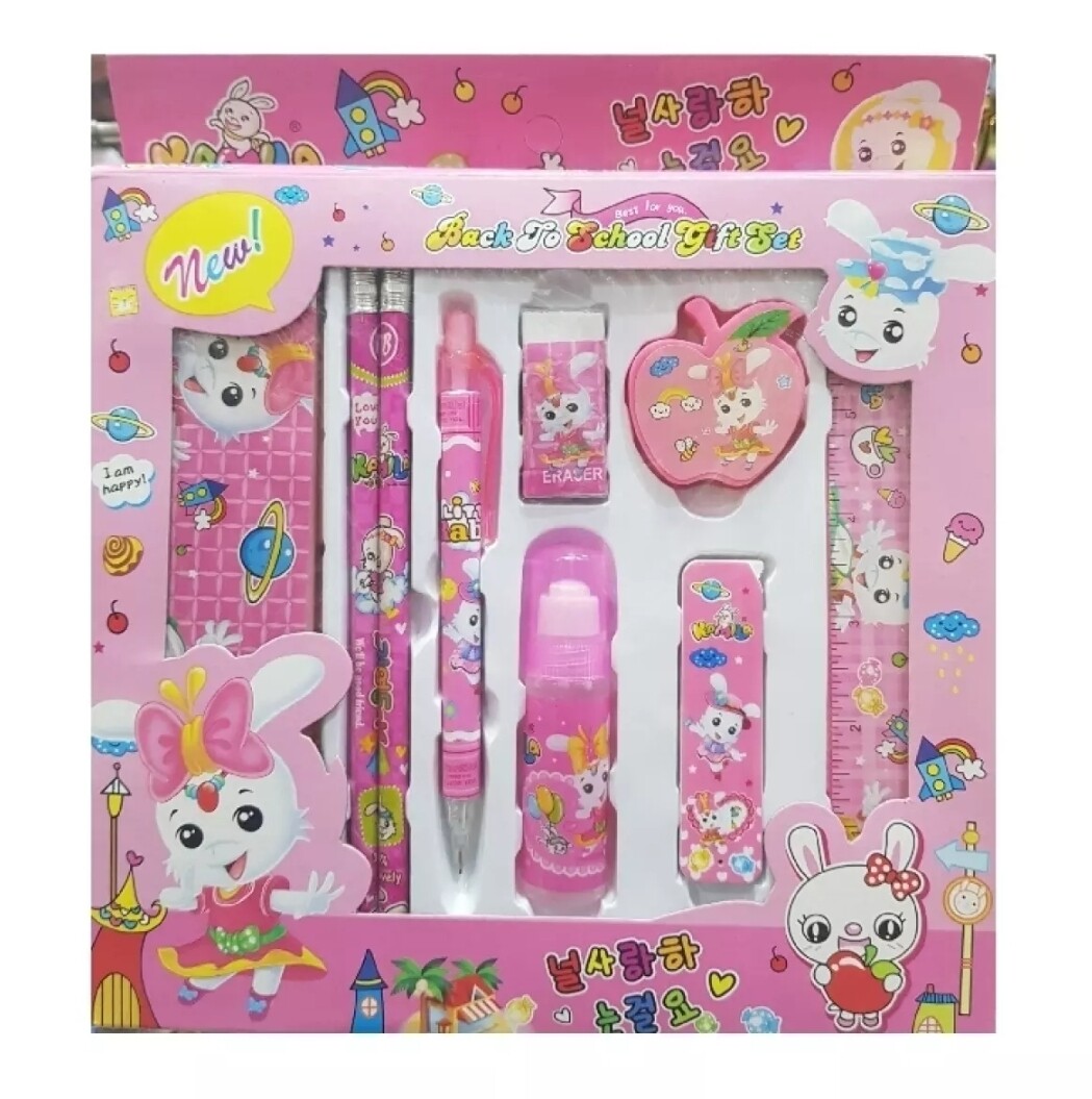 - Items: 1pc Plastic Pencil Box, 2pc Pencil, 1pc Eraser, 1pc Srapner, 1pc Mechanical Pencil with Refil Box, 1pc 6'' Plastic Scale