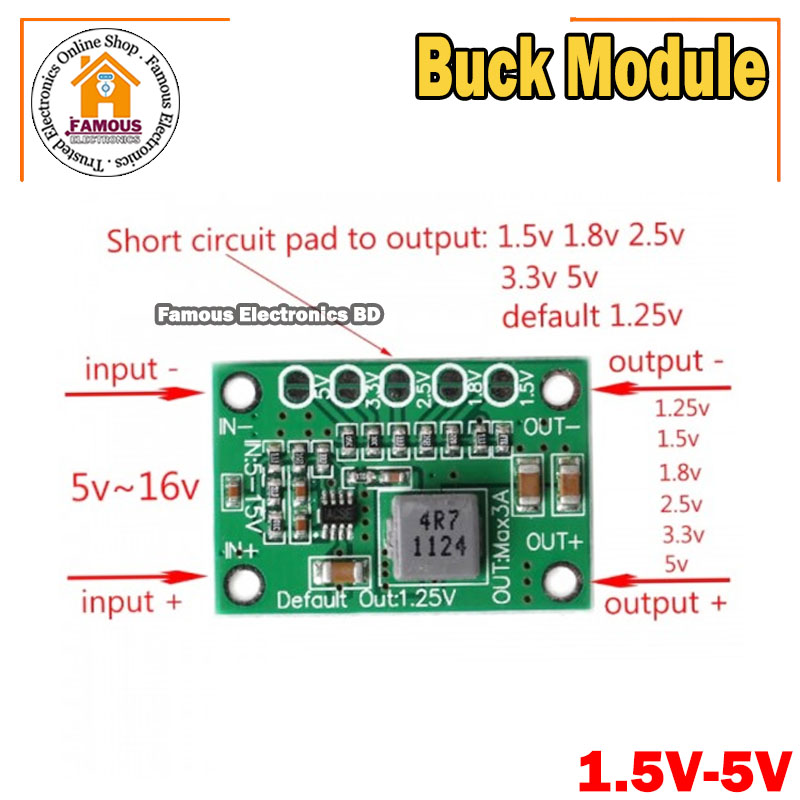 - Step down Power Module 5V - 16V to 1.5V, 1.8V, 2.5V, 3.3V, 5V Universal Adjustable Buck Voltage Converter Board 3A
