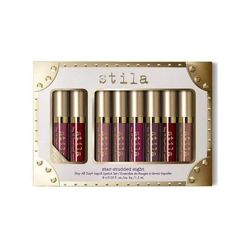 Get eight times the creamy, weightless color with Stila's Star-Studded Eight Stay All Day Liquid Lipstick Set. Featuring a mix of iconic matte shades and new shimmer hues, this set of deluxe-size liquid lipsticks has you covered. THE DETAILS Includes: Patina Shimmer (dusty rose with shimmer), Beso Shimmer (true red with shimmer), Perla (pale dusty pink), Patina (dusty rose), Aria (magenta plum), Chianti (deep plum), Rubino (beet red), and Sogno (warm rose) 8 x 0.05 fl oz