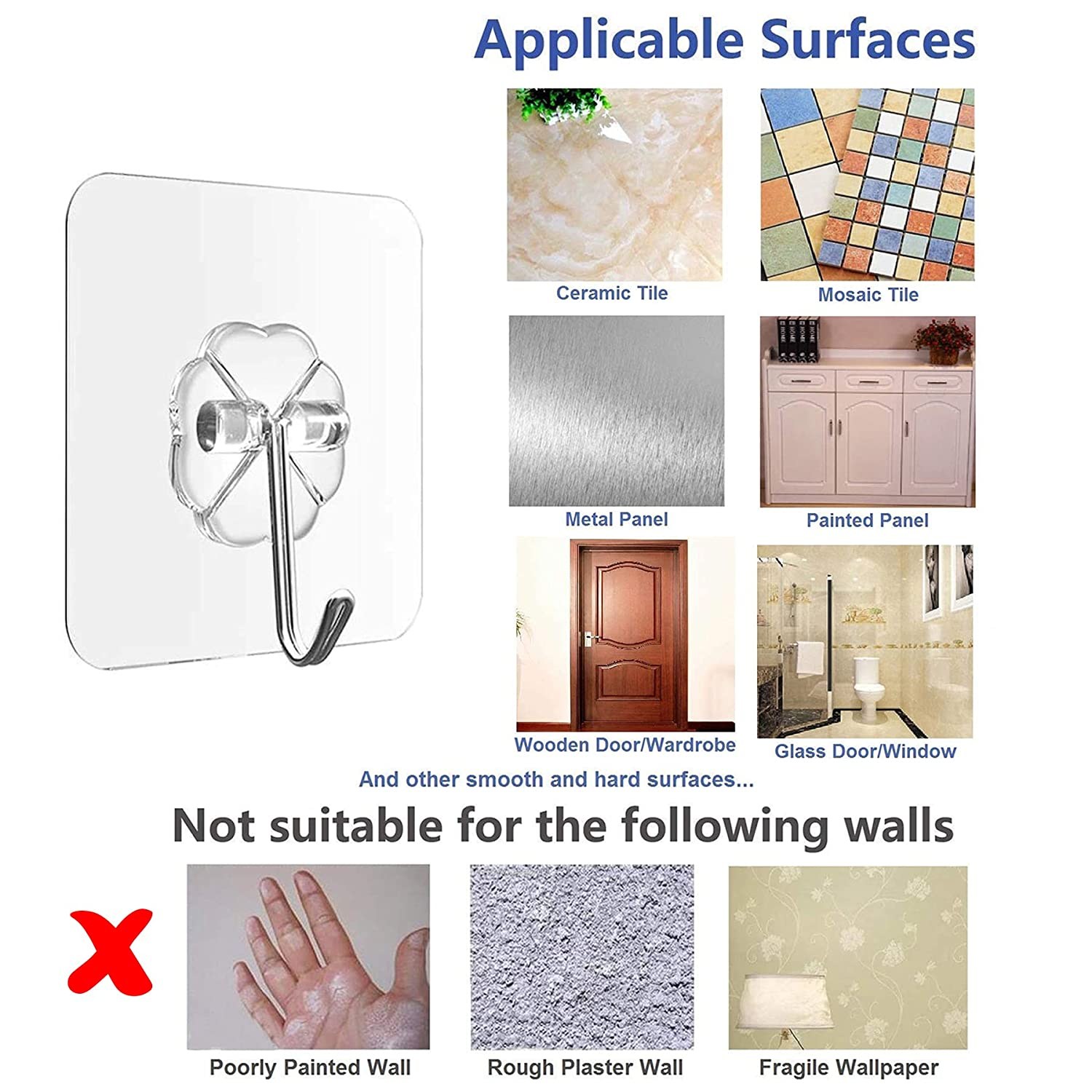 - Hooks are widely applied on wood, glass, frosted glass, glass grid, ceramic tiles, metal surface, painted walls and other hard flats surface