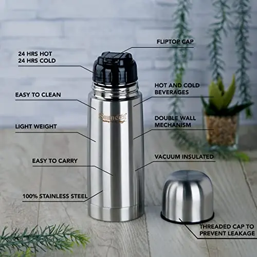 Every Sumeet product is carefully built to deliver exceptional quality. Sumeet presents Double Walled Insulated Stainless-Steel Flask which keeps water or beverages hot up to 24 hours or cold up to 24 hours as per the requirement. It encourages you to live healthy lifestyle by switching to steel, TRUST IN EVERY DROP. Its superior insulation high performance vacuum technology with Premium quality Stainless Steel construction makes sure that it Maintains the temperature of the liquid for 24 hours. It’s condensation resist property ensures that the Flask does not sweat or leave behind wet rings on the surface. This Flask has Matt Finishing which enhances the appeal and very user friendly too. Rust-proof and odor-free body keeps the liquids fresh and ready to be sipped when you need them the most. This Flask is made of High-Quality Stainless-Steel body, Food-Grade and Non-Toxic, BPA-Free Stainless-Steel material that makes the Flask safe for use on a regular basis. A unique Fliptop lid that makes pouring completely hassle-free and spill-free, the lid of this bottle doubles up as a cup for drinking, simple threaded lid for easy use. The shape of the Flask enables it to fit in all types of your bags easily. This stainless-steel Flask is reusable and recyclable and ideal to carry to your school, sports, office, travel, yoga, gym, or any outing. Store your favorite tea, coffee or hot chocolate and enjoy it while traveling or cold water as you set out. This Flask is easy to clean and dishwasher safe too. Pack contents: 1 Flask: l x w x h (cm): 7 x 7 x 20, Weight:0.260kg, Capacity: 500 ml