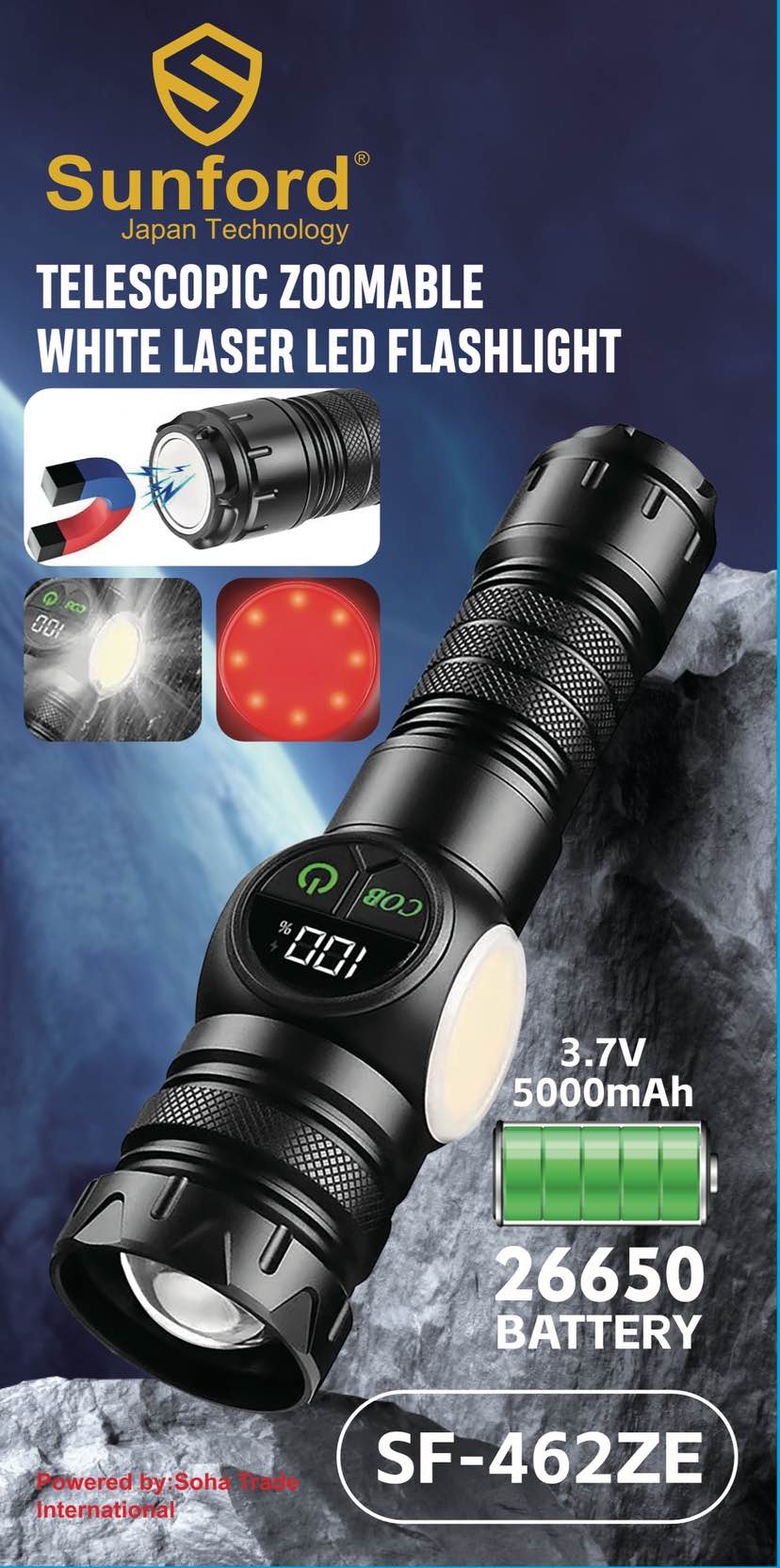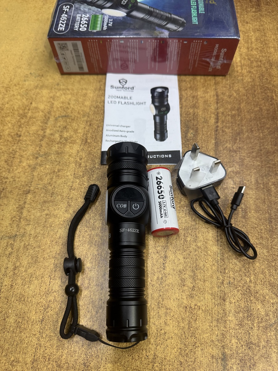 Sunford SF-462ZE Telescopic Zoomable Multifunctional 30W High Powered LED Zoom Torch / Flashlight with Power Bank and Emergency Lighting Facility - 1 Piece ( Black )