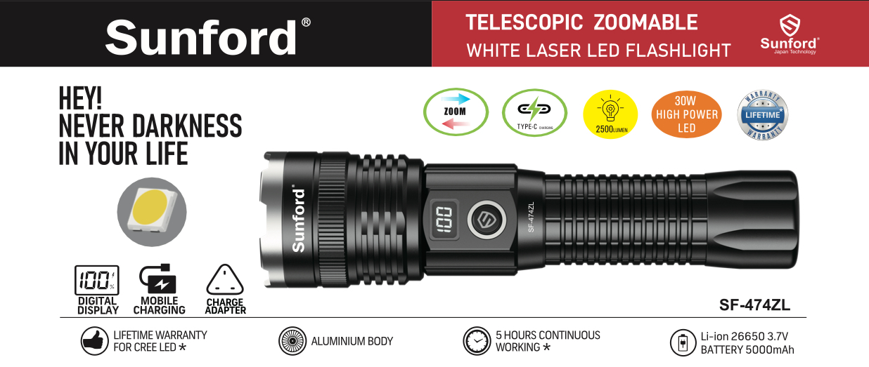 Sunford SF-474ZL Telescopic Zoomable 30W High Power White LASER LED Flashlight / Torch with Digital LED Display & Power Bank Facility - 1 Piece ( Black )