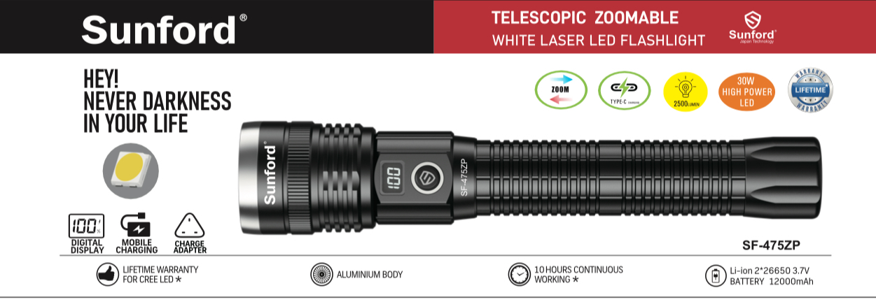 Sunford SF-475ZP Telescopic Zoomable 30W High Power White LASER LED Zoom Flashlight / Torch with Digital LED Display & Power Bank Facility - 1 Piece ( Multicolor )
