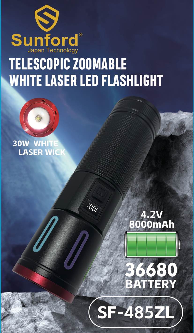 Sunford SF-485ZL LED Display Telescopic Zoomable 30W High Powered LED Zoom Torch / Flashlight with Power Bank Facility - 1 Piece ( Black )
