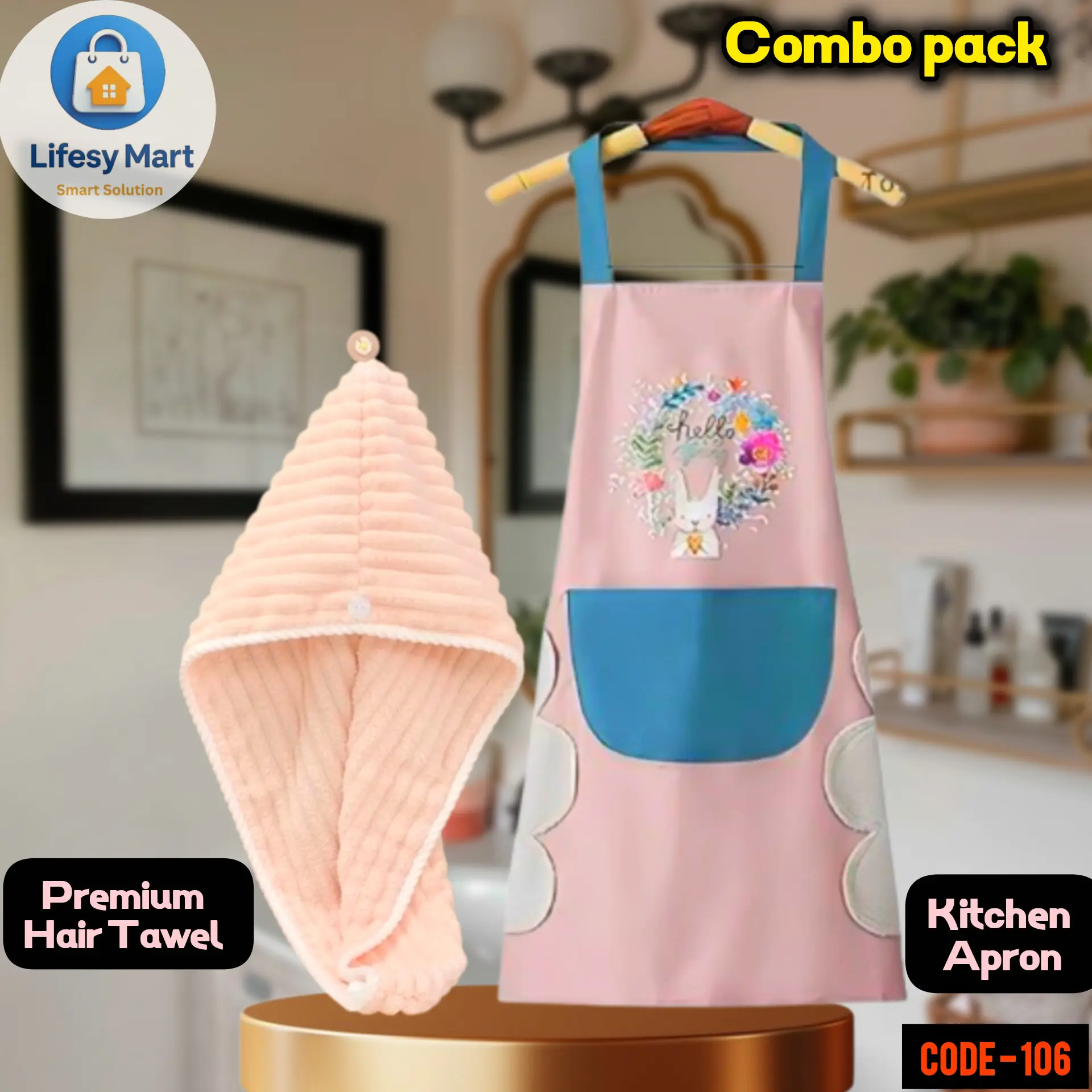 Super Absorbent Hair Towel Wrap & Premium Kitchen Apron Combo Pack | Quick-Drying Hair Turban & Waterproof Cooking Apron
