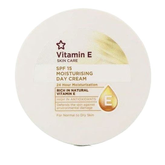 Superdrug's Vitamin E SPF 15 Moisturising Day Cream provides 24 Hour Moisturisation. HIGH IN ANTIOXIDANTS. Defends the skin against environmental damage.