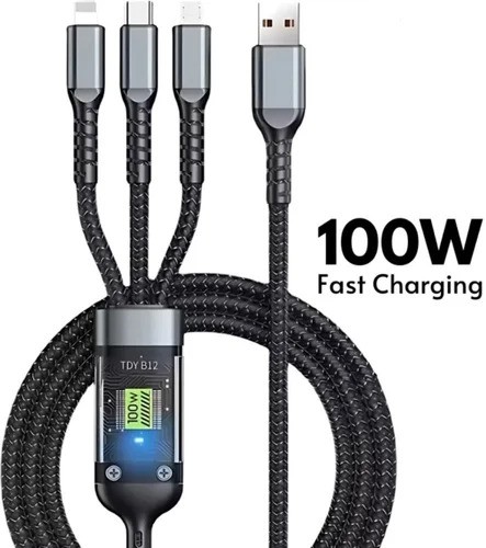 100 W 3-in-1 Fast Charging Cable (USB-A to Type-C + Lightning + Micro USB)