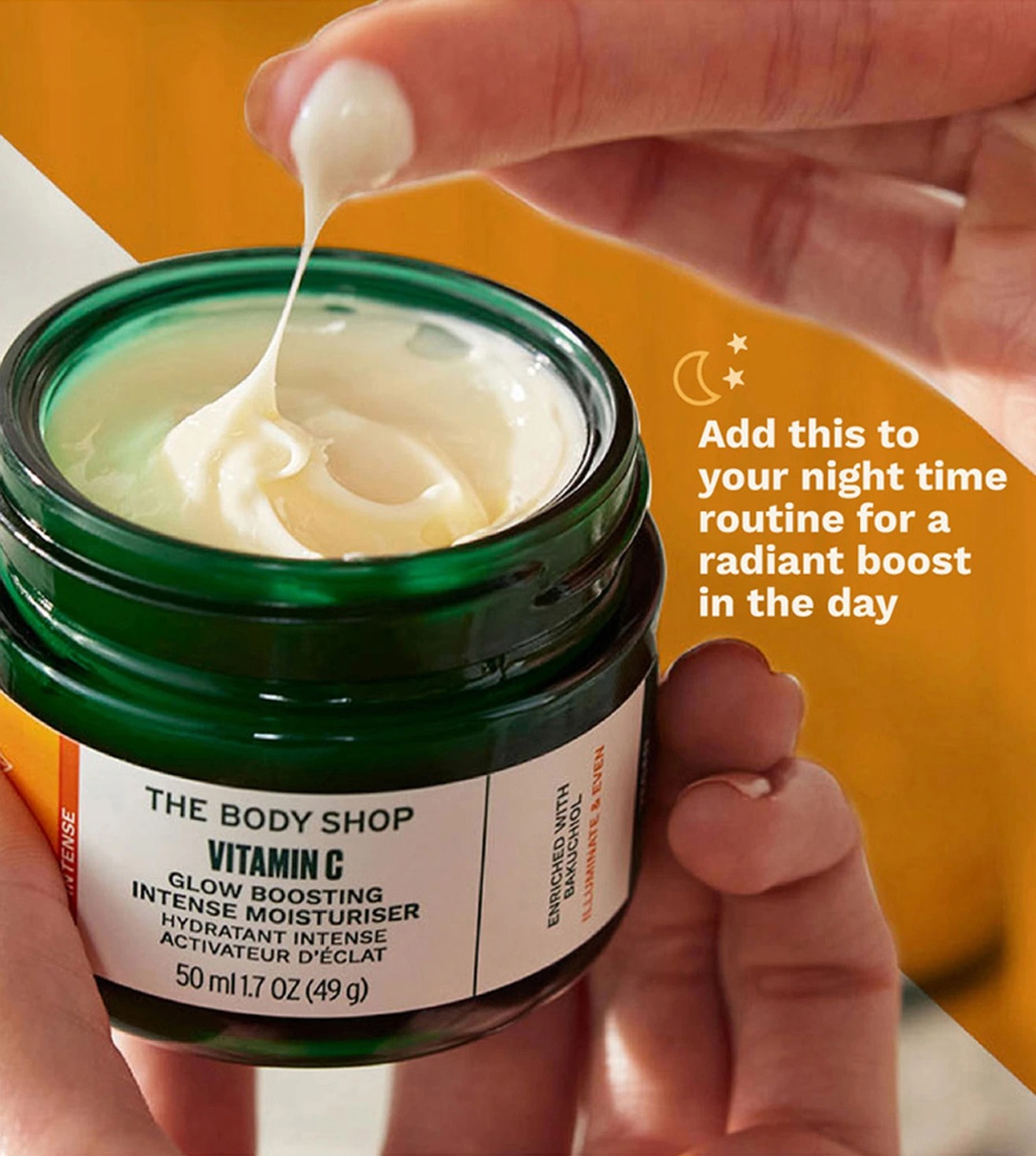 - Scoop a pea-sized amount of our Glow-Boosting Vitamin C Moisturizer onto your fingertips and smooth it all over your face and neck every morning and night.