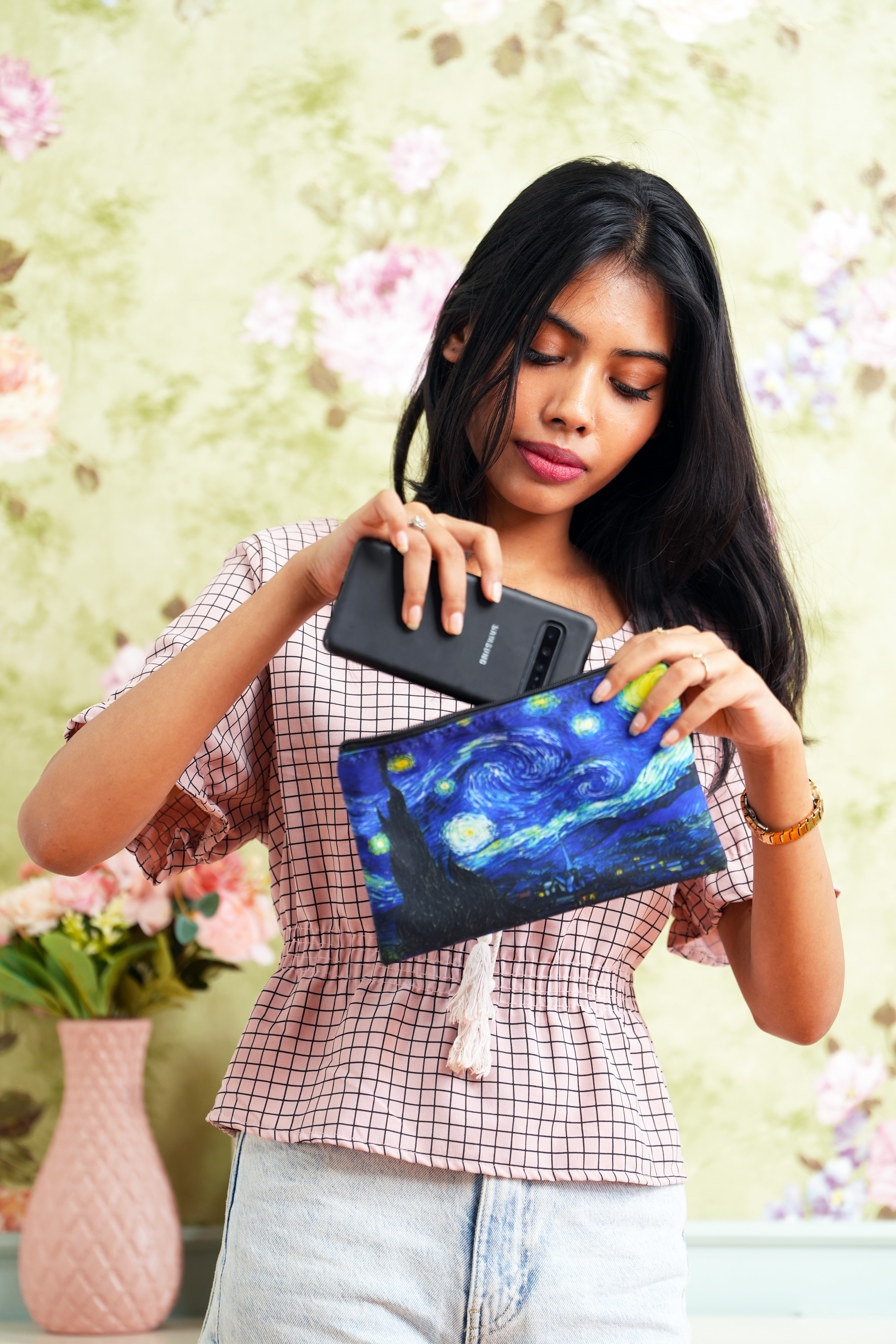 Artistic Elegance Meets Versatility: Adorned with "The Starry Night" by Vincent van Gogh, this pouch bag is a true masterpiece. You can carry a touch of art wherever you go, transforming your daily routine into an aesthetic experience. Whether you're an art enthusiast or simply appreciate timeless beauty, this pouch bag is a statement piece.