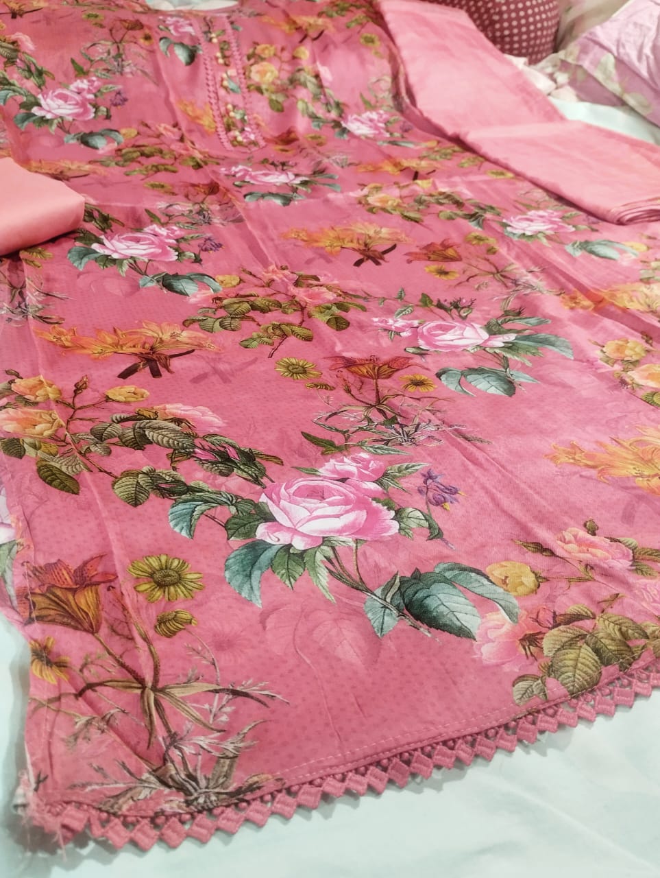 Upgrade your wardrobe with this beautiful 3-piece Salwar Kameez set crafted from premium cotton fabric. The outfit features a charming printed design enhanced with delicate embroidery and sparkling sequin work, giving it a perfect blend of elegance and comfort. Ideal for casual gatherings, semi-formal events, or festive wear, this suit is designed to keep you stylish and comfortable all day long.