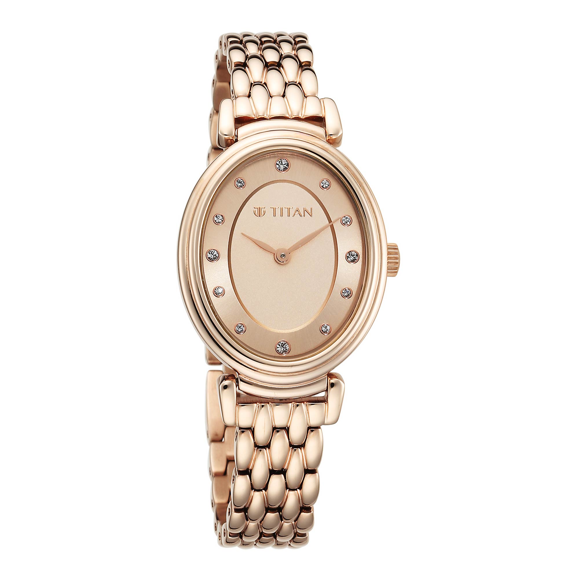 Titan Purple Mainline Ph2 for Ladies with Rose Gold Stainless Steel Strap , Rose Gold Dial Colour , Oval P2H Quartz Case , Case Size: 37.50mm Width 28mm Length 7.30mm Thickness