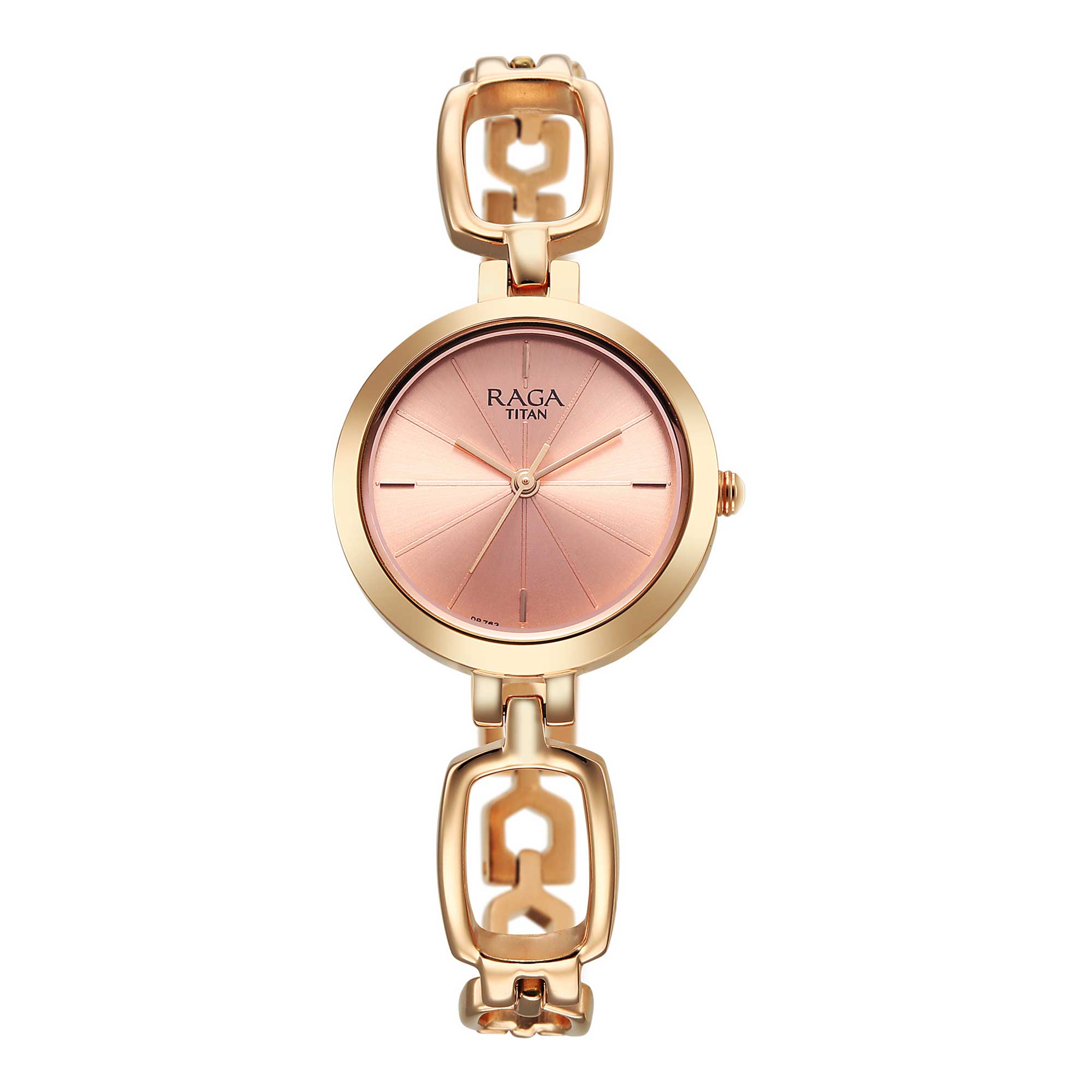 Titan EXCLUSIVE IBD RAGA UPGRADE for Ladies with Rose Gold Brass Strap , MGM Glass , ROS Dial Colour , ROUND P3H P3H Case , 6.76 mm Thickness with Bracelet Clasp Lock , Water Resistance: 3AT
