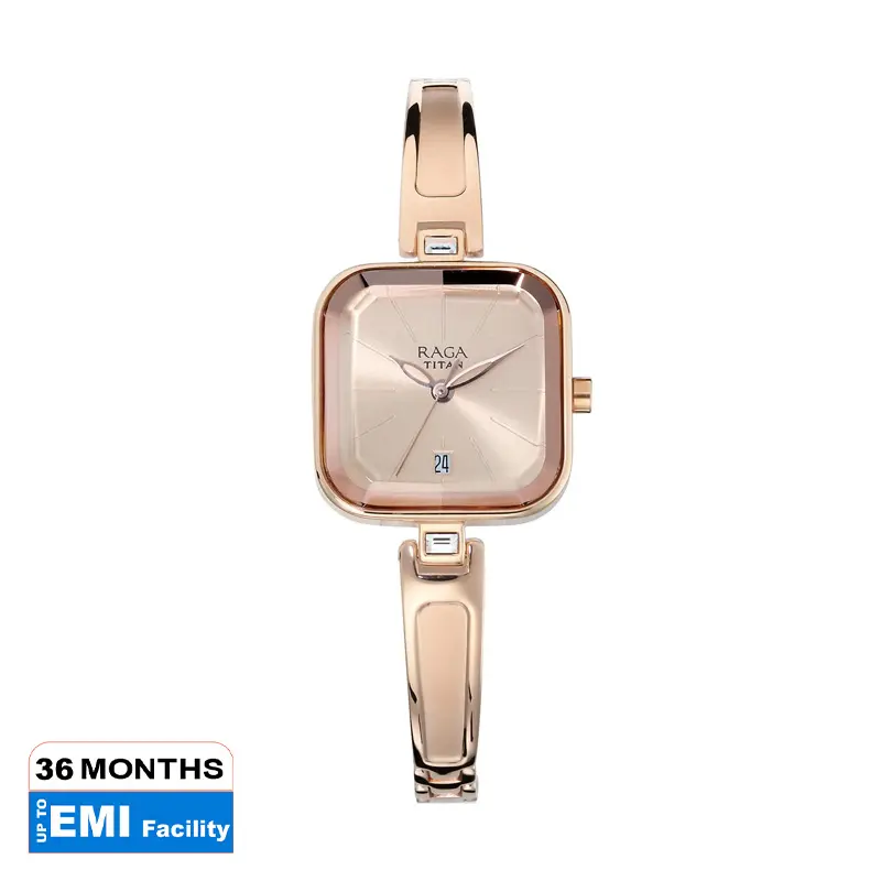 Titan Raga Viva 2 for Ladies with Rose Gold Brass Strap , Mineral Glass Glass , Rose Gold Dial Colour , Shaped 3HM+Date Quartz Case , Case Size: 25 mm Width 32 mm Length 8 mm Thickness with Jewellery Lock , Water Resistance : 3 ATM