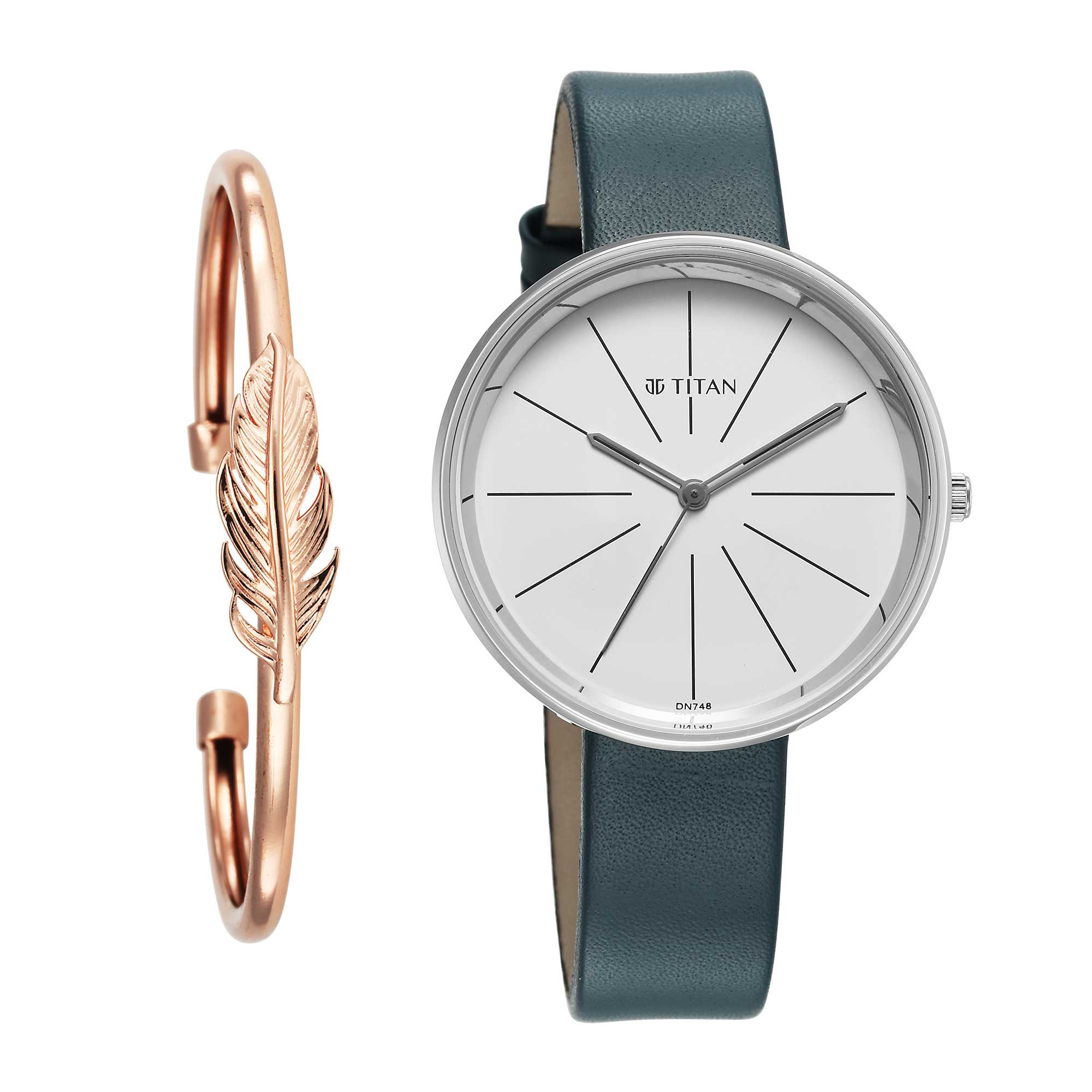 Titan Purple Stackables Ph-2 for Ladies with Teal Leather Strap , White Dial Colour , Round P3H Quartz Case , Case Size: 36 Width 36 Length 7.25 Thickness