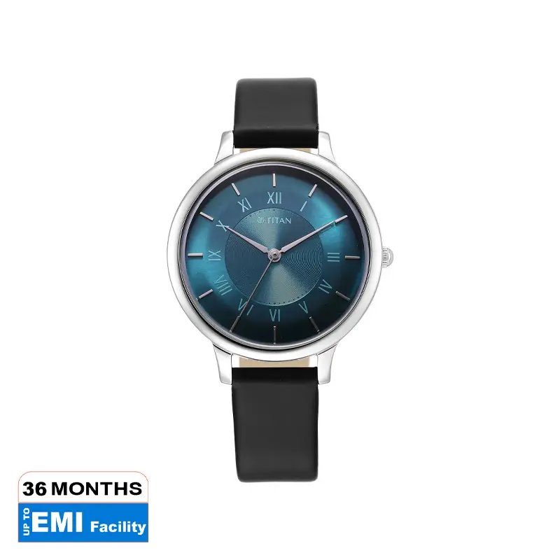 Titan NEO 9 RETRO Ladies for Ladies with Black Leather Strap , Mineral Glass Glass , Dark Blue Dial Colour , Round P3H Quartz Case , Case Size: 42.4mm Width 35.40mm Length 8.30mm Thickness with Buckle Lock , Water Resistance : 5 ATM