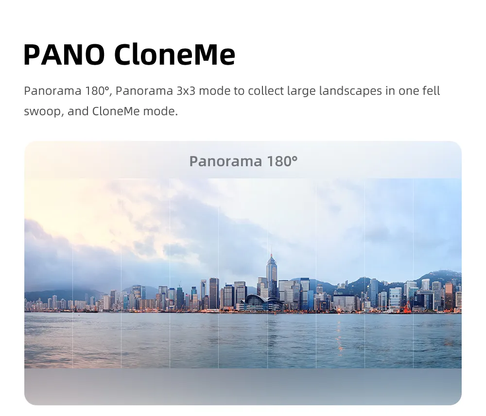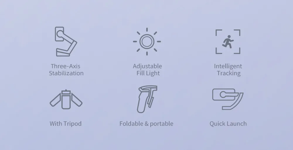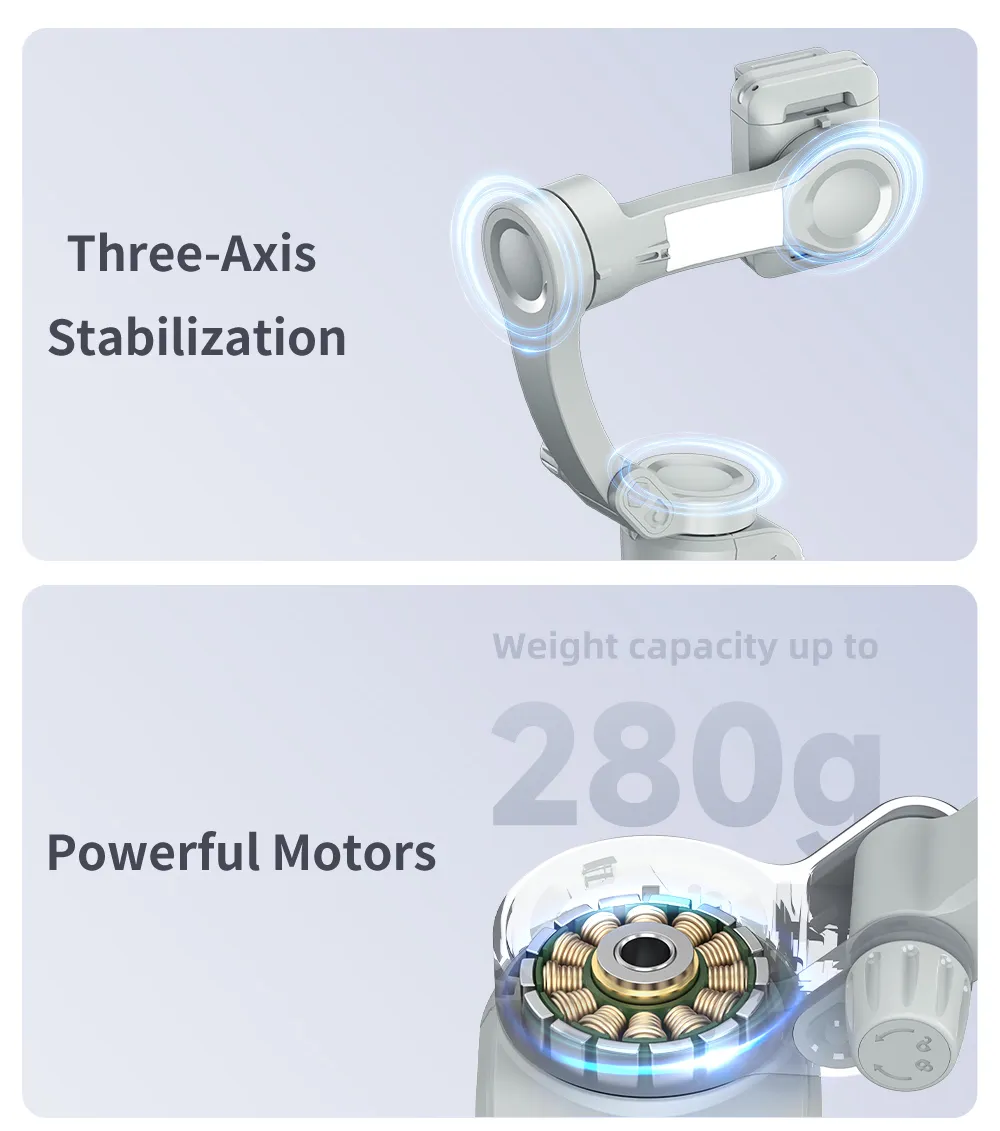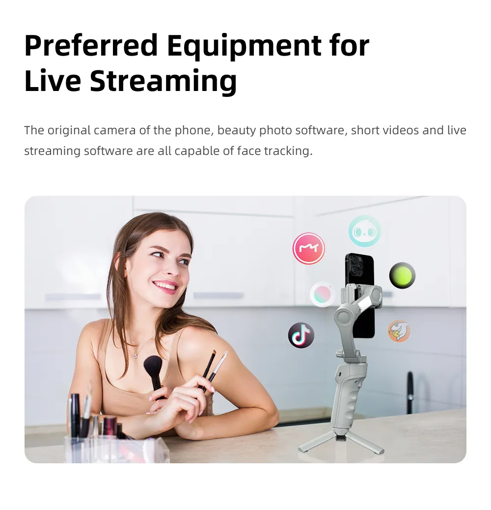 \n2. Multi-functional keyboard, convert front and rear cameras with one click, switch multiple modes at will. \n \n3. Powerful motor, supports phones up to 280g in weight, more powerful anti-shake function. \n \n4. AI smart tracking, can be used when live broadcasting alone. \n \n5. With beauty fill light, 3 light modes and 9 brightness levels, no worries about at night. \n \n6. Built in 3600mAh battery, up to 8 hours working time. \n \n7. APP built-in multiple functions, like LIFE mode, gesture control, PANO CloneMe, Dyna-Zoom, timelapse, Live streaming. \n \nProduct Parameters: