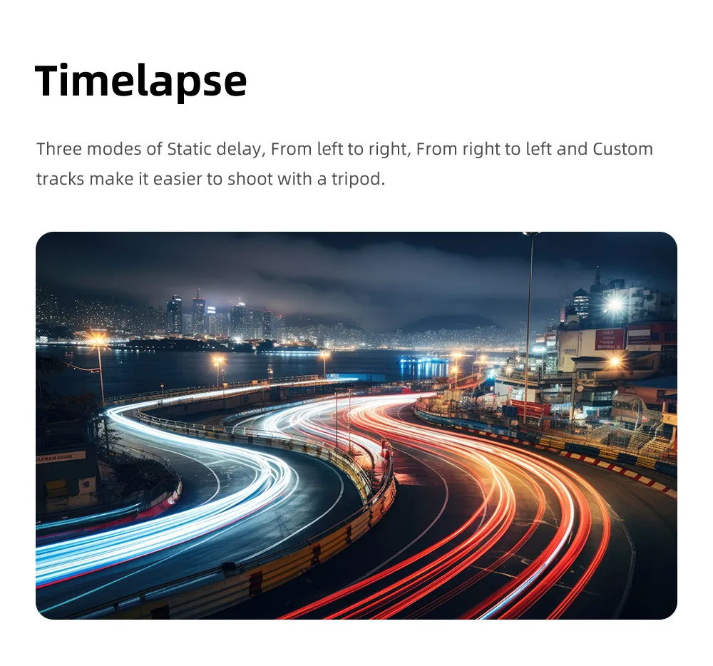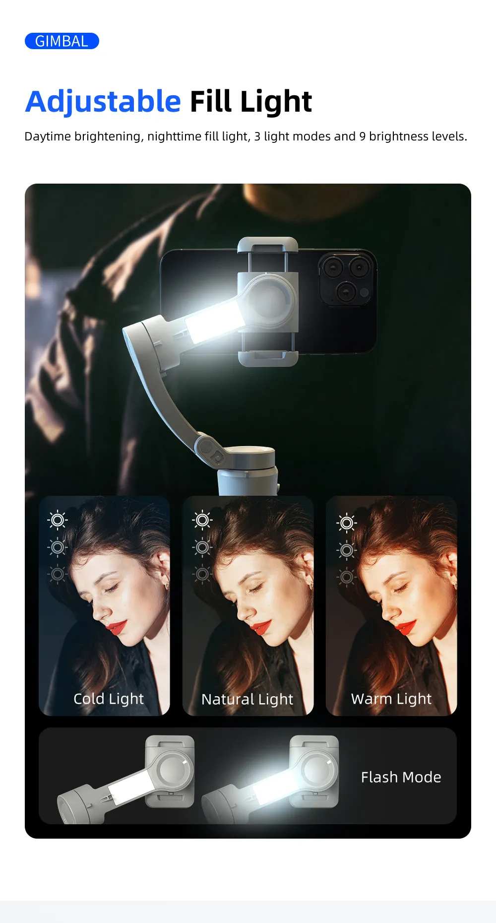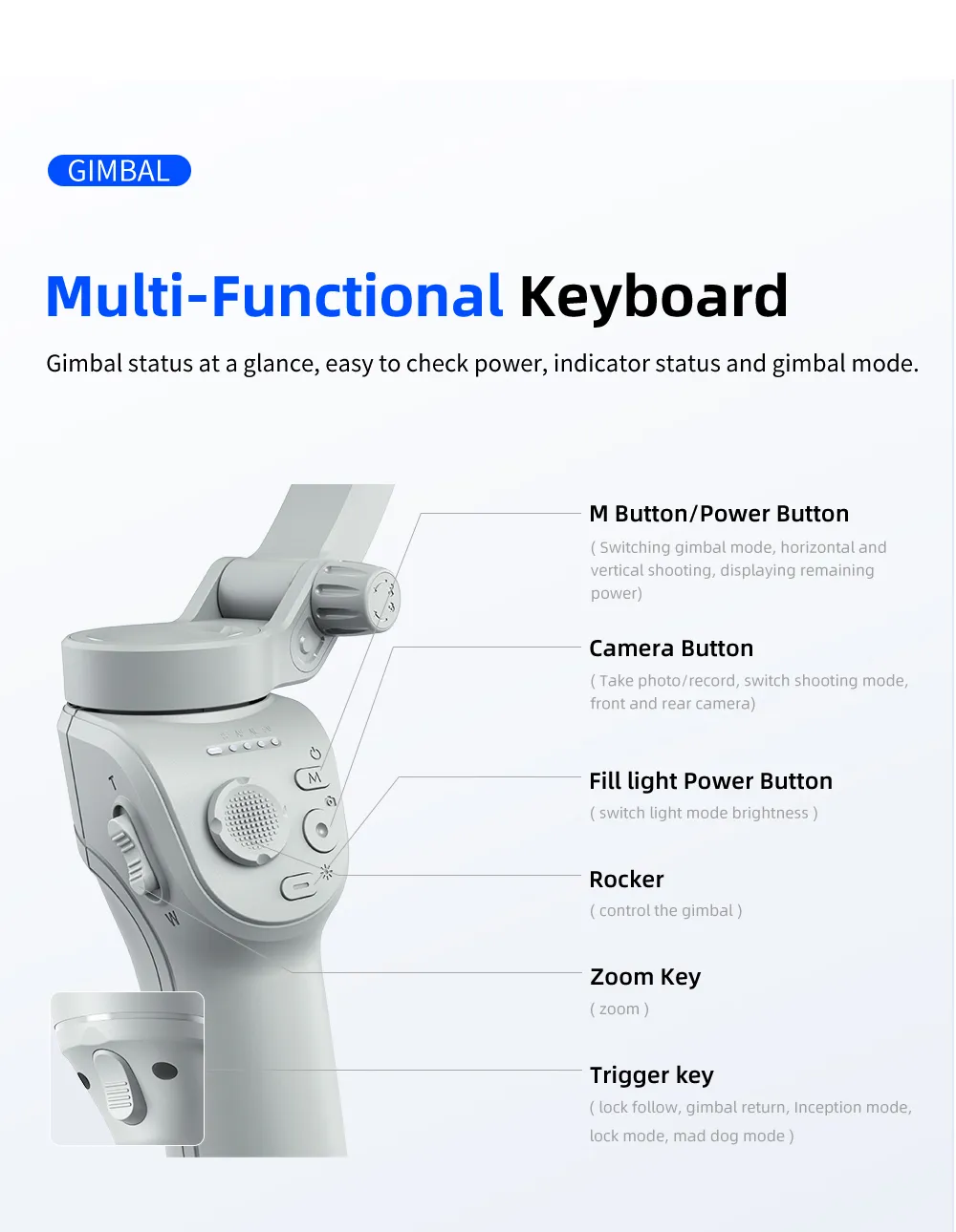 \n2. Multi-functional keyboard, convert front and rear cameras with one click, switch multiple modes at will. \n \n3. Powerful motor, supports phones up to 280g in weight, more powerful anti-shake function. \n \n4. AI smart tracking, can be used when live broadcasting alone. \n \n5. With beauty fill light, 3 light modes and 9 brightness levels, no worries about at night. \n \n6. Built in 3600mAh battery, up to 8 hours working time. \n \n7. APP built-in multiple functions, like LIFE mode, gesture control, PANO CloneMe, Dyna-Zoom, timelapse, Live streaming. \n \nProduct Parameters: