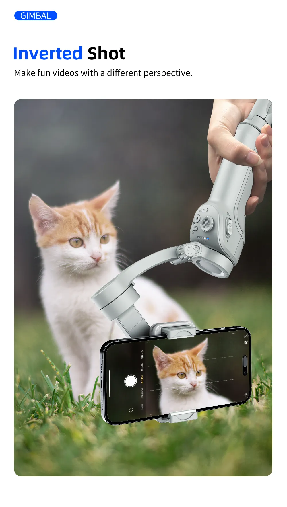 \nWalking, running, jumping without shaking the picture. \n-- 3-axis stabilization \n-- Powerful motors \n-- Two-handed grip for more stability
